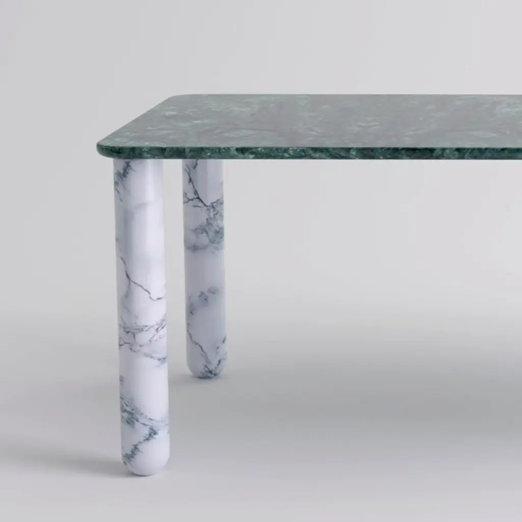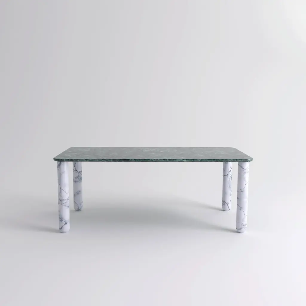 X Large green and white marble "Sunday" dining table, Jean-Baptiste SouletieDimensions: 200 W x 100 D x 74.5 H cmMaterials: white Pele de Tigre marble legs, Indian Green marble top.Different finishes and sizes are available.Sunday is a family of dinner tables, coffee tables and consoles with a simple and sculptural design. The mix of heavy marble legs and a thin solid wood top creates an interesting contrast while the rounded edges and generous proportions provide a comforting feeling.Sunday is all about the materials: 3 marbles and 2 woods are available in the collection.Sunday comes in a wide variety of dimensions and 2 different marble legs heights to perfectly fit your interior whether you need a small coffee table, a large one, a console, or even a dinner table that will seat 10 guests on a friendly Sunday lunch.Jean-Baptiste Souletie is the Co-founder of the furniture editor La Chance with Louise Breguet. He studied in India, worked for a merchant bank in London (where he designed their new offices), before working for an investment fund (where he redevised the graphic chart), and in the strategic department of a luxury goods company in Paris. He returned to his first loves, architecture and furniture, when he founded La Chance in 2012.