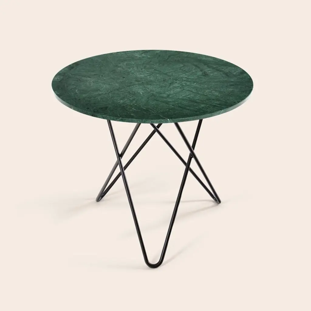 Green Indio Marble and Black Steel Dining O Table by OxDenmarqDimensions: D 80 x H 72 cmMaterials: Steel, Green Indio MarbleAlso Available: Different marble and frame options available,OX DENMARQ is a Danish design brand aspiring to make beautiful handmade furniture, accessories and lighting in natural high-quality materials in fair prices. " When we set out back in 2003, we were primarily working with vegetable-tanned saddle leather thus the name OX was a tribute to our unique leather and the animal providing it.The other half of our name, DENMARQ, is chosen to emphasize that we are a Danish design brand based on the Danish design tradition and that most of our furniture is produced in Denmark. However, DENMARQ not only refers to our home country, but also to the co-founder and designer - DENnis MARQuart.Before finishing his design studies at the Copenhagen Design University, Dennis Marquart did a Blacksmith education. This background is extremely useful when developing and designing products."OX DENMARQ handmade products will only get more beautiful as time passes and natural patina sets in.Many OX products are shaped around marble or vegetable-tanned saddle leather. Stone and leather are materials that will, and should, get marks over time. But they will also age with a very special beauty. When you learn to appreciate the beauty of maturity and of time passing, you have learned to appreciate patina the way it should be appreciated.