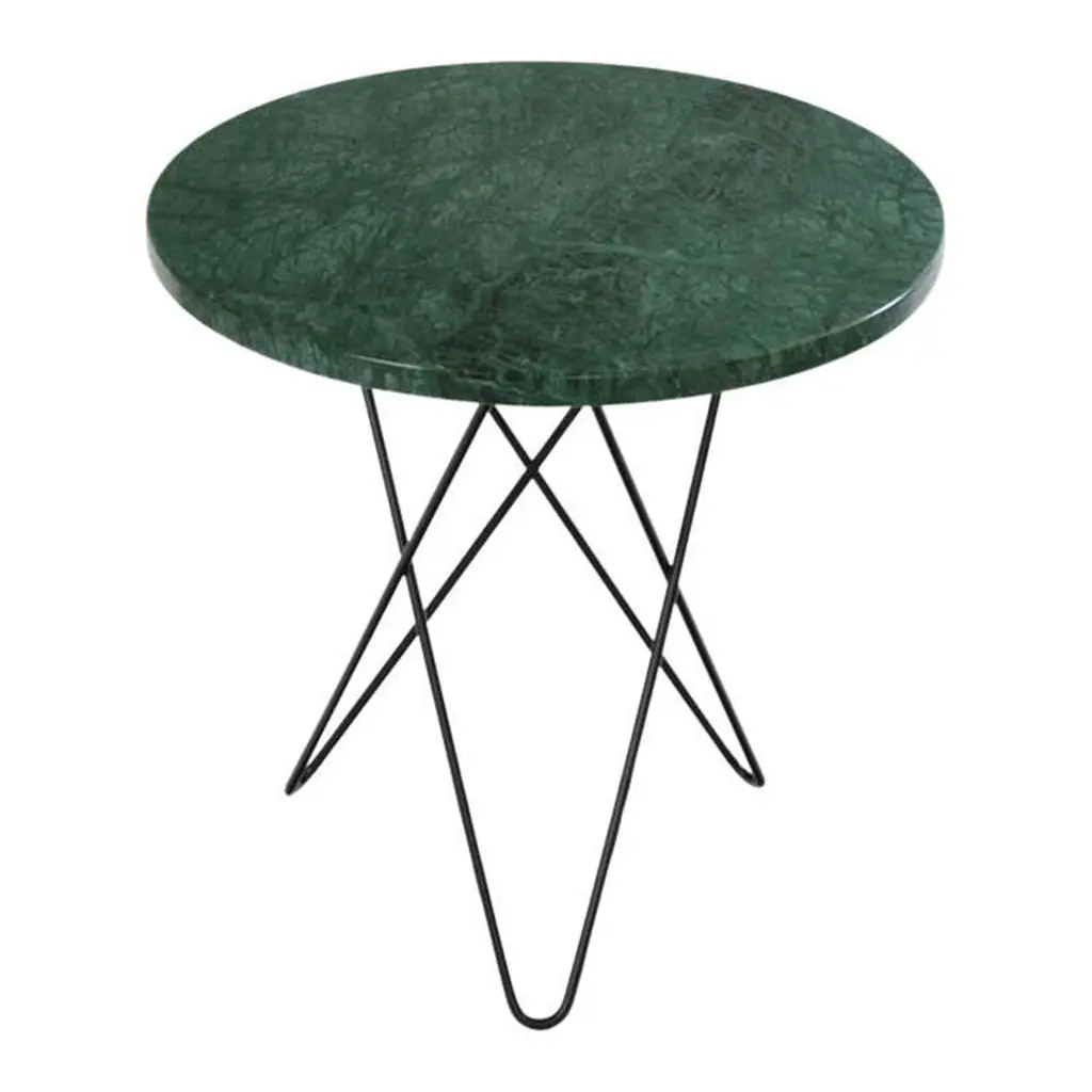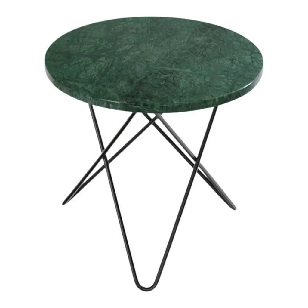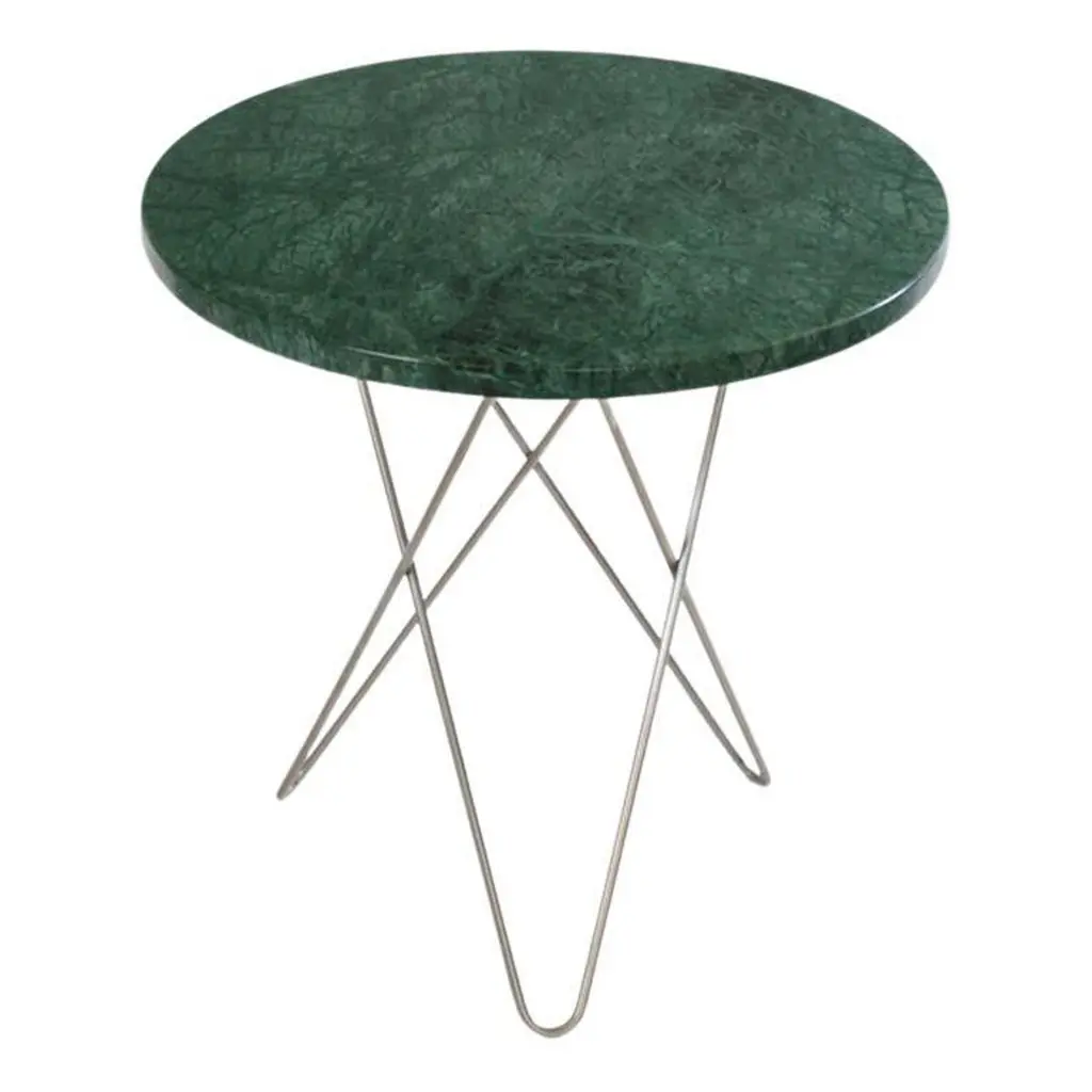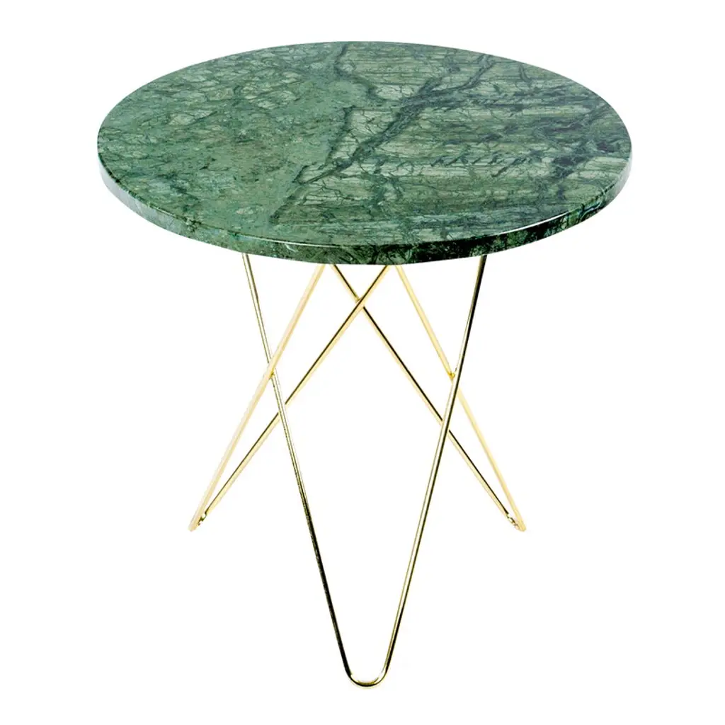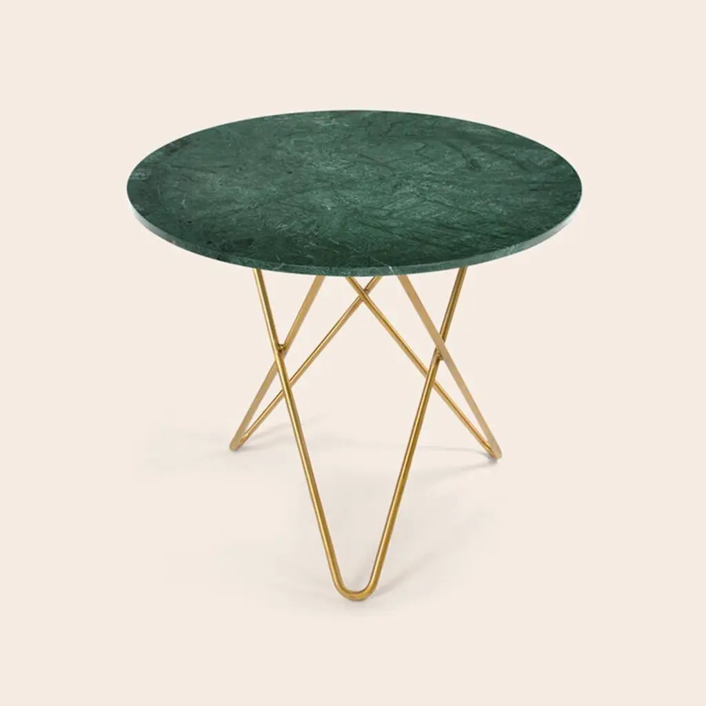 Green indio marble and brass dining O table by OxDenmarqDimensions: D 80 x H 72 cmMaterials: Brass, Green Indio MarbleAlso Available: Different marble and frame options available.OX DENMARQ is a Danish design brand aspiring to make beautiful handmade furniture, accessories and lighting in natural high-quality materials in fair prices. "When we set out back in 2003, we were primarily working with vegetable-tanned saddle leather thus the name OX was a tribute to our unique leather and the animal providing it.The other half of our name, DENMARQ, is chosen to emphasize that we are a Danish design brand based on the Danish design tradition and that most of our furniture is produced in Denmark. However, DENMARQ not only refers to our home country, but also to the co-founder and designer - Dennis Marquart.Before finishing his design studies at the Copenhagen Design University, Dennis Marquart did a Blacksmith education. This background is extremely useful when developing and designing products."OX DENMARQ handmade products will only get more beautiful as time passes and natural patina sets in.Many OX products are shaped around marble or vegetable-tanned saddle leather. Stone and leather are materials that will, and should, get marks over time. But they will also age with a very special beauty. When you learn to appreciate the beauty of maturity and of time passing, you have learned to appreciate patina the way it should be appreciated.