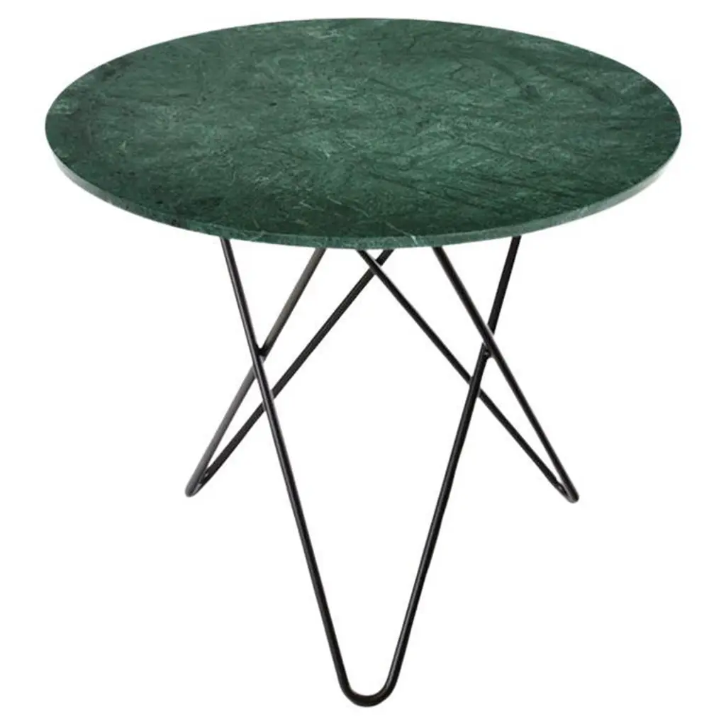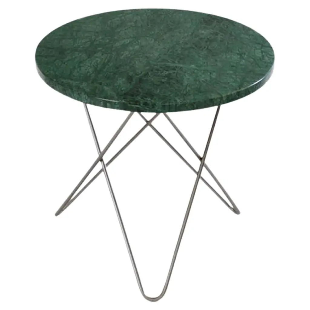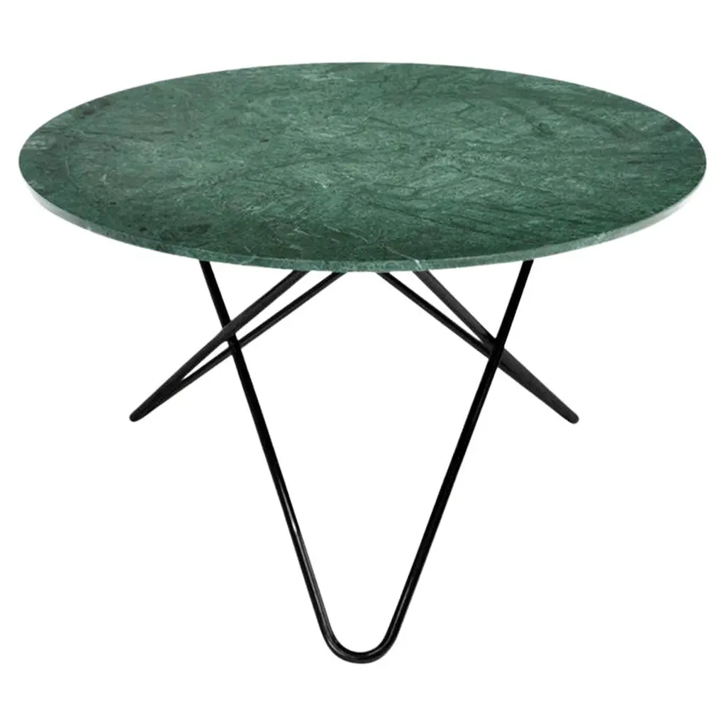 Green Indio marble and stainless steel large dining o table by OxDenmarqDimensions: D 100 x H 72 cmMaterials: Steel, Green Indio MarbleAlso Available: Different marble and frame options available.OX DENMARQ is a Danish design brand aspiring to make beautiful handmade furniture, accessories and lighting in natural high-quality materials in fair prices. "When we set out back in 2003, we were primarily working with vegetable-tanned saddle leather thus the name OX was a tribute to our unique leather and the animal providing it.The other half of our name, DENMARQ, is chosen to emphasize that we are a Danish design brand based on the Danish design tradition and that most of our furniture is produced in Denmark. However, DENMARQ not only refers to our home country, but also to the co-founder and designer - DENnis MARQuart.Before finishing his design studies at the Copenhagen Design University, Dennis Marquart did a Blacksmith education. This background is extremely useful when developing and designing products."OX DENMARQ handmade products will only get more beautiful as time passes and natural patina sets in.Many OX products are shaped around marble or vegetable-tanned saddle leather. Stone and leather are materials that will, and should, get marks over time. But they will also age with a very special beauty. When you learn to appreciate the beauty of maturity and of time passing, you have learned to appreciate patina the way it should be appreciated.