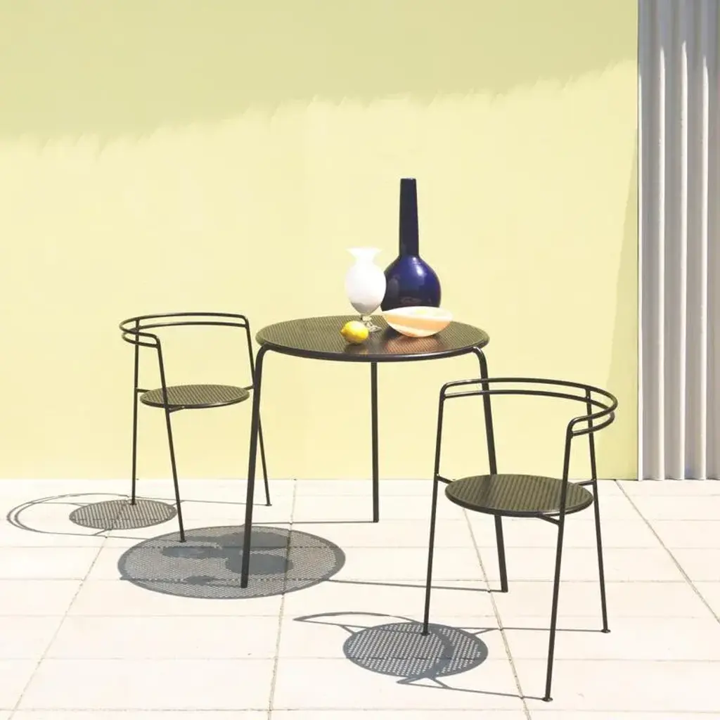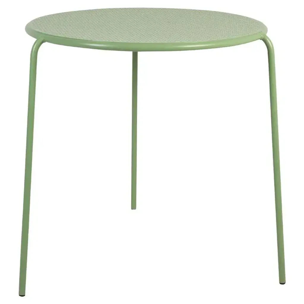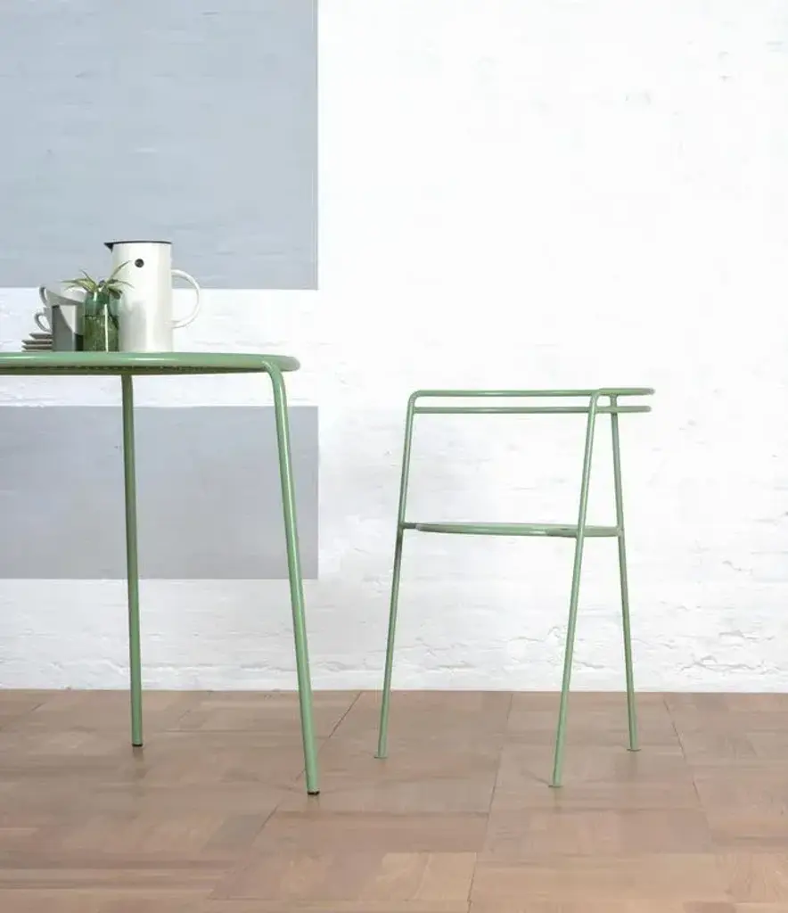 Green point table by ok design dimensions: d 79 x w 76.5 x h 73 cm. Materials: powder-coated metal. The point table is a modern and minimal outdoor dining table. It elegantly combines a minimalistic silhouette with geometrical shapes that complements any space. The table is designed to match perfectly with the point chairs, making it an ideal choice for those who want to create a cohesive and stylish outdoor seating area. Crafted from durable and weather-resistant powder-coated metal, the point table is ideal for outdoor use and ensures long-lasting durability.