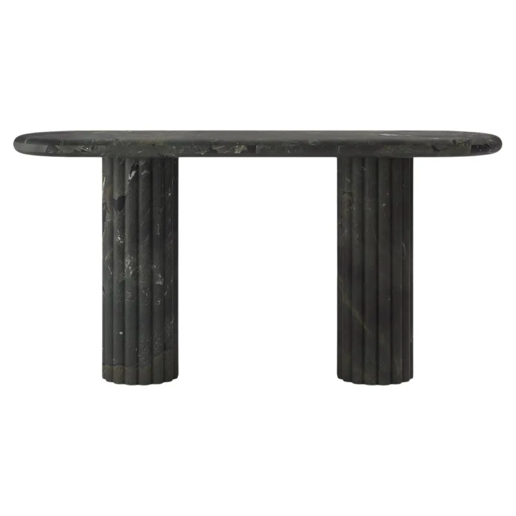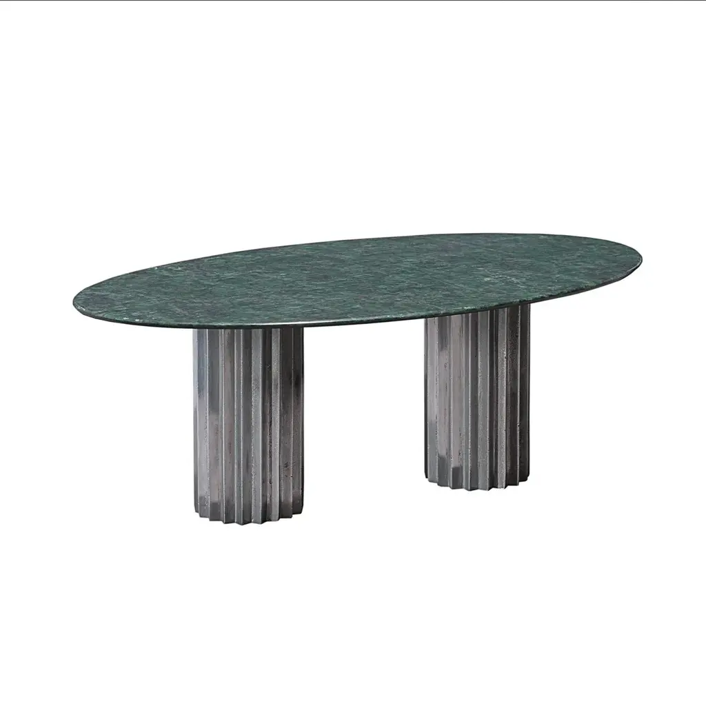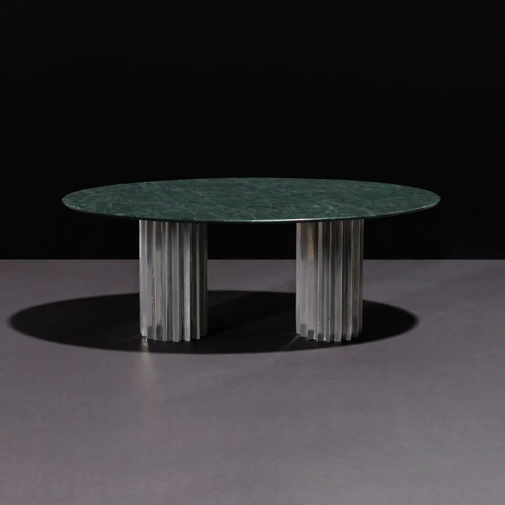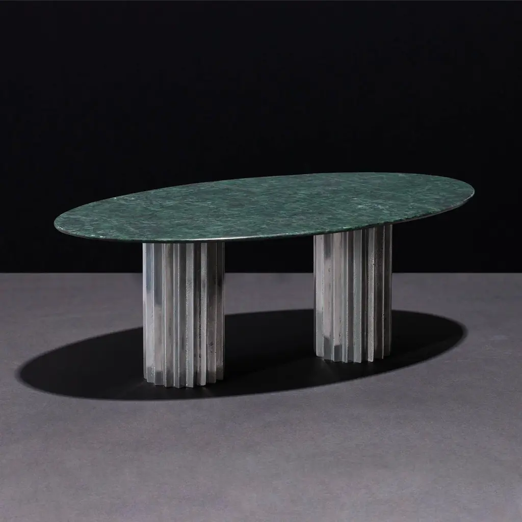 Dining table with green Serpentino marble top and multifaceted pedestals in cast aluminum. Inspired by Doric columns in archaic architecture, the extruded multi-point star pedestal has a different finish on each vertical face: the cast metal is polished on one side but left raw on the other. The shading is amplified by the different finishes resulting in a dramatic effect. Crafted in Tuscany, Italy, in a foundry specialized in bronze sculptures, serving artists among the most renowned in the world. Standard top material: green Serpentino marble. Standard pedestal material: aluminum (polished and coarse). Standard size: oval top 200x110 cm (seats 8), top thickness 2 cm, pedestal diameter 36 cm. Imprinted by Maker,Imprinted by Maker