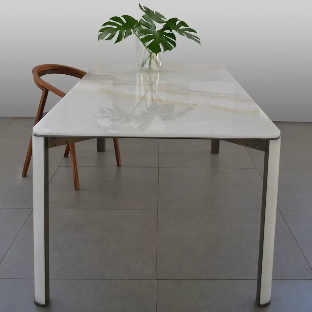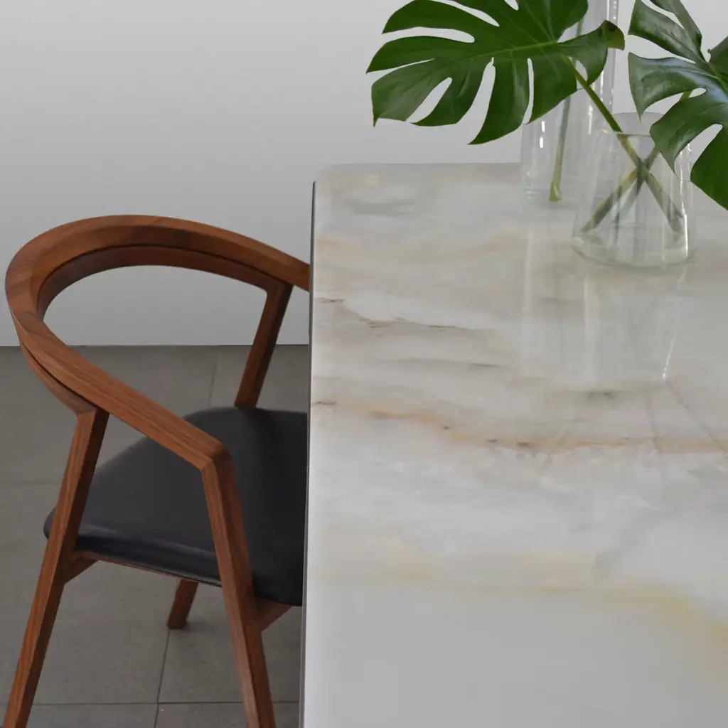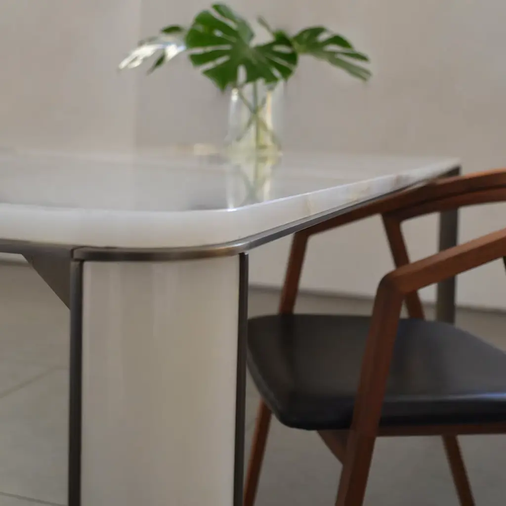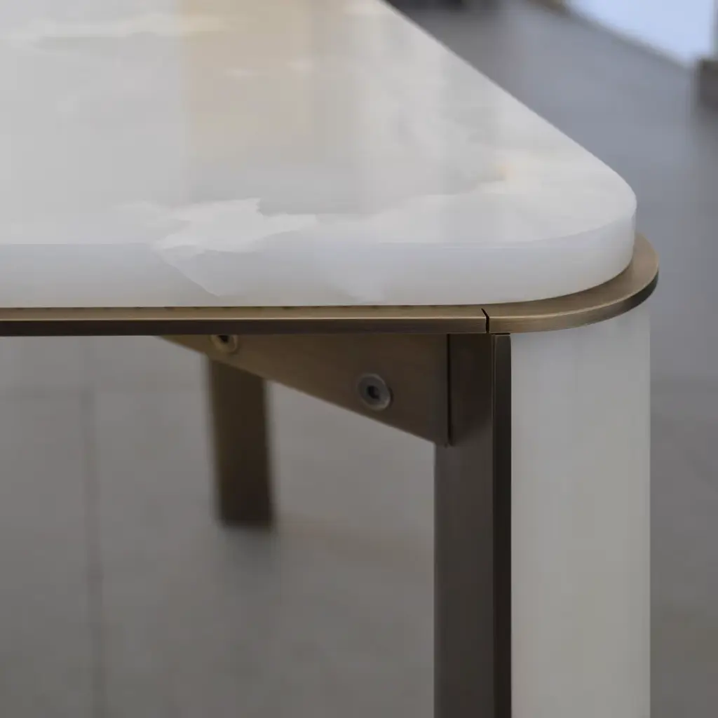 This dining table, designed by Monica Geronimi, features a timeless design that combines modern lines, curved angles, and classic materials. The structure in steel supports a top and mounted legs in onyx. A splendid table that can be used in the dining room at home or as a conference table in the office, this piece is highlighted by inserts in bronzed brass, that strikingly complements the stone around it. The dimensions of the table are customizable and the shapes available are either squared, rectangular, or round.