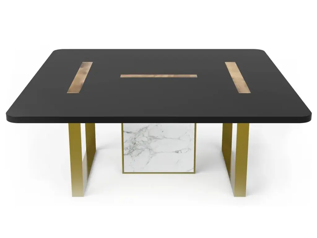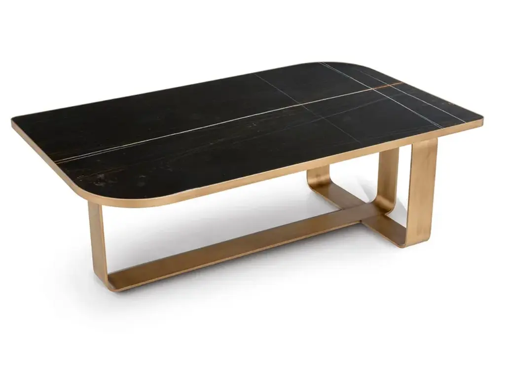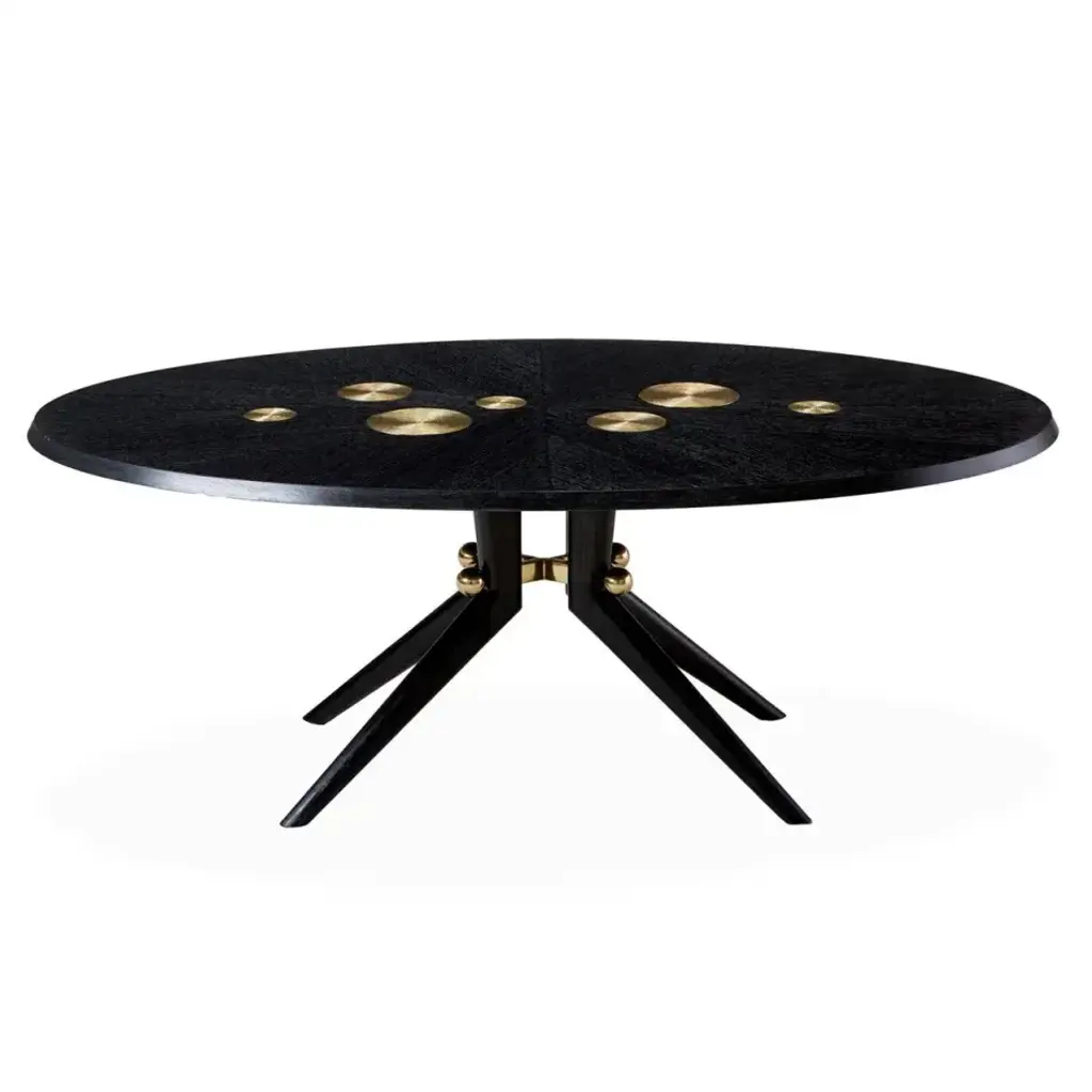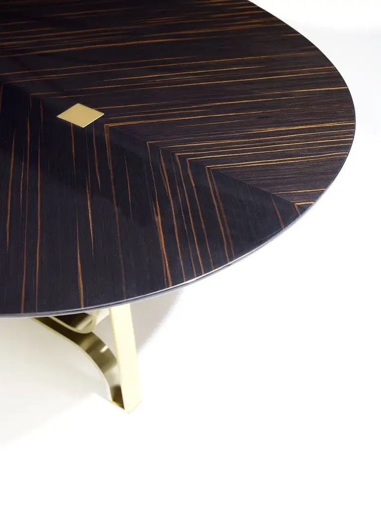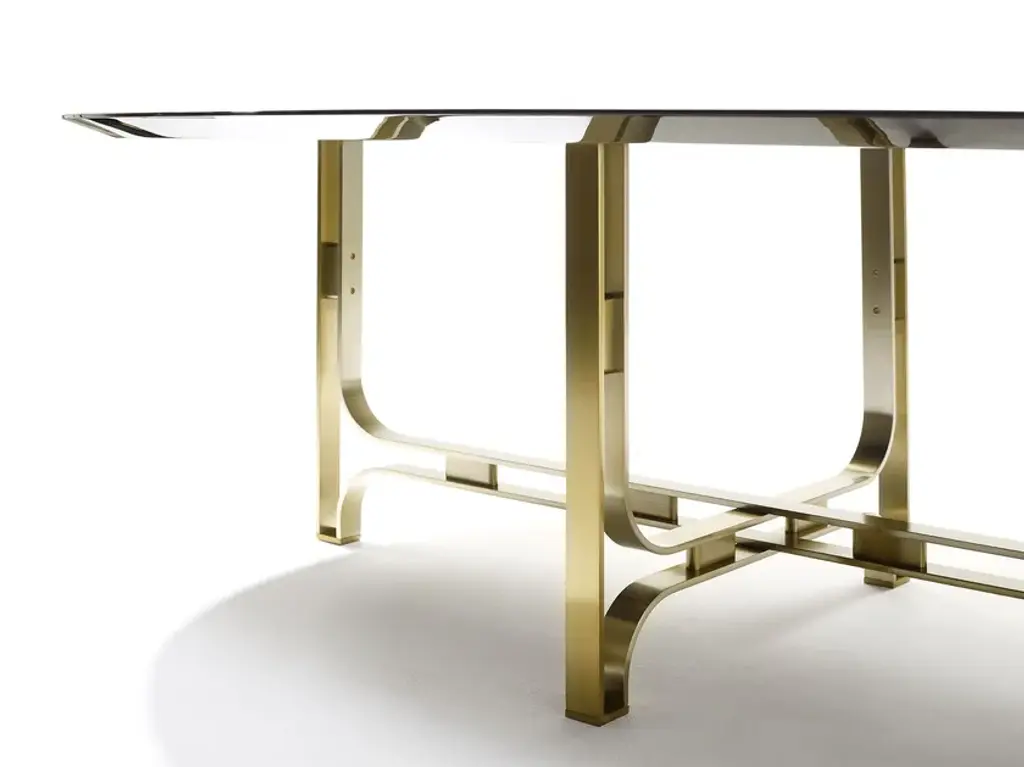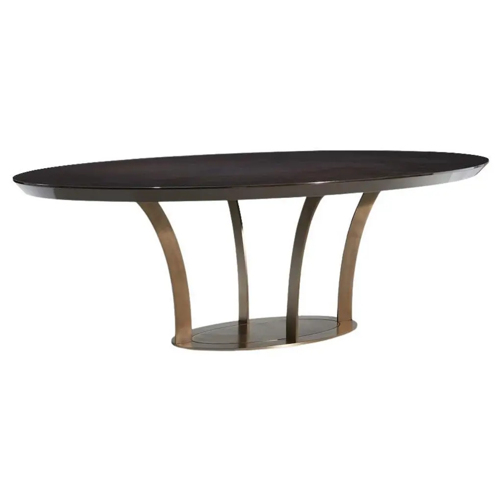 Gregory dining table with metal base and oval top available in different materials.Gregory - Tables with structure made in thick metal flat bar, with brushed brass finishing. Tops available in many different combination like veneers, marbles and parchment. The curved junctions and the functional details add elegance to these magnificent pieces of furniture.