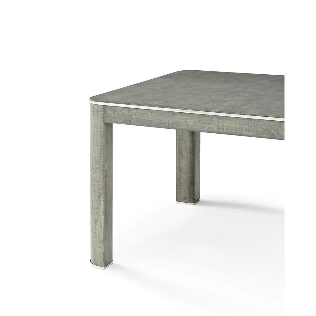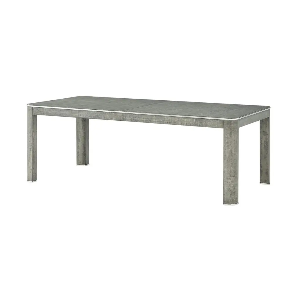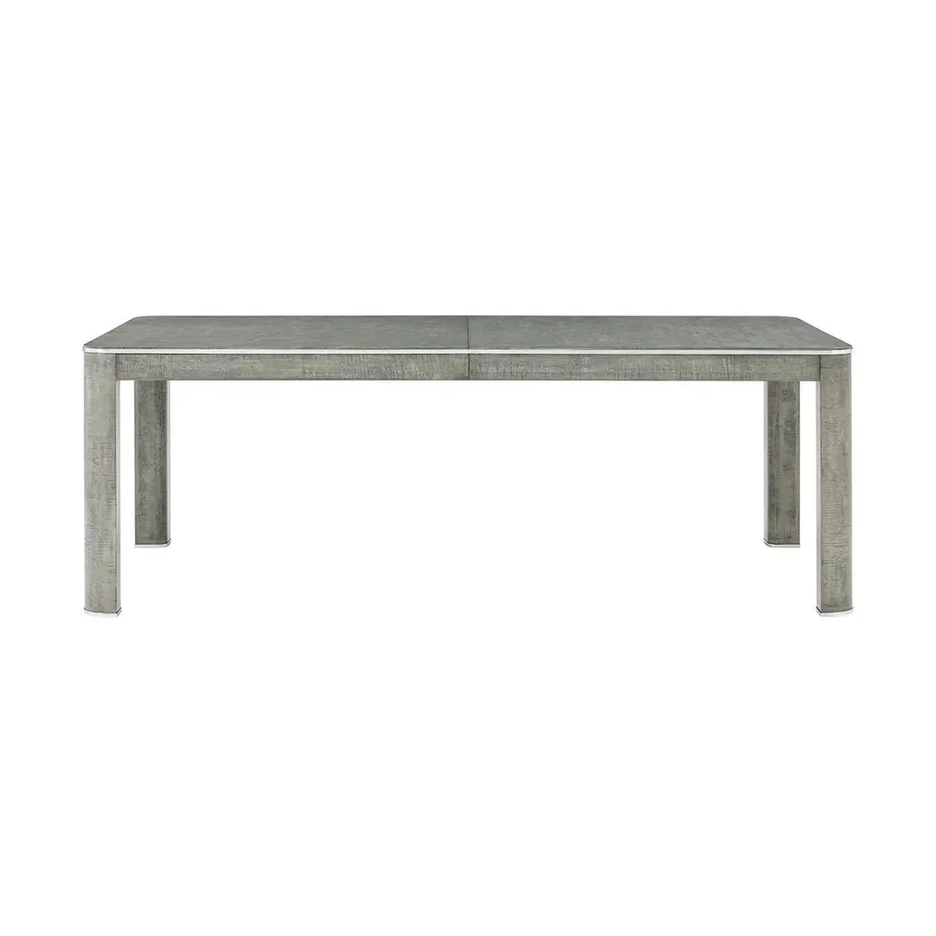 This elegant piece features brushed stainless steel accents that beautifully complement the Pebble Grey finished rich maple veneers, creating a harmonious blend of modern and classic design elements. The extending feature allows you to easily accommodate additional guests, ensuring everyone has a place at the table. Crafted with attention to detail and built for durability, the Grey Art Deco Extending Dining Table is the perfect centerpiece for your dining room, combining style and functionality seamlessly.Open Dimensions: 120" W x 42" D x 30" HClosed Dimensions: 84" W x 42" D x 30" Hwith 2x 18" leaves.