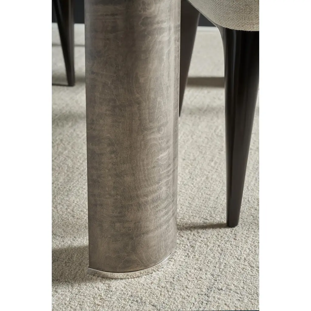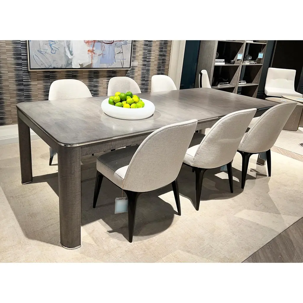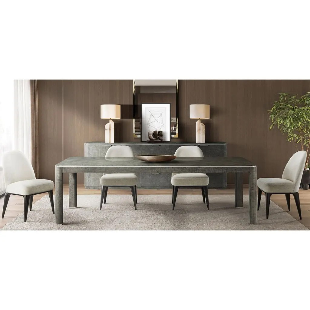 This elegant piece features brushed stainless steel accents that beautifully complement the Pebble Grey finished rich maple veneers, creating a harmonious blend of modern and classic design elements. The extending feature allows you to easily accommodate additional guests, ensuring everyone has a place at the table. Crafted with attention to detail and built for durability, the Grey Art Deco Extending Dining Table is the perfect centerpiece for your dining room, combining style and functionality seamlessly.Open Dimensions: 120" W x 42" D x 30" HClosed Dimensions: 84" W x 42" D x 30" Hwith 2x 18" leaves.