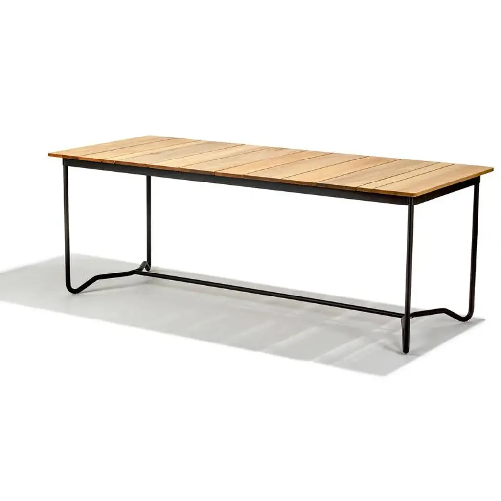 Grinda dining furniture comes in teak with a black painted steel frame. Grinda dining furniture includes a side chair, arm chair and four different sizes of tables to decorate your balcony, veranda, wooden deck, the lawn or wherever you choose to arrange lovely dinner parties. Although it has a minimalistic look, the spring steel frames of the chairs, as well as the gently curved wood in the seat, make it very comfortable. In the back, the wood is elegantly pierced by the steel frame. Features