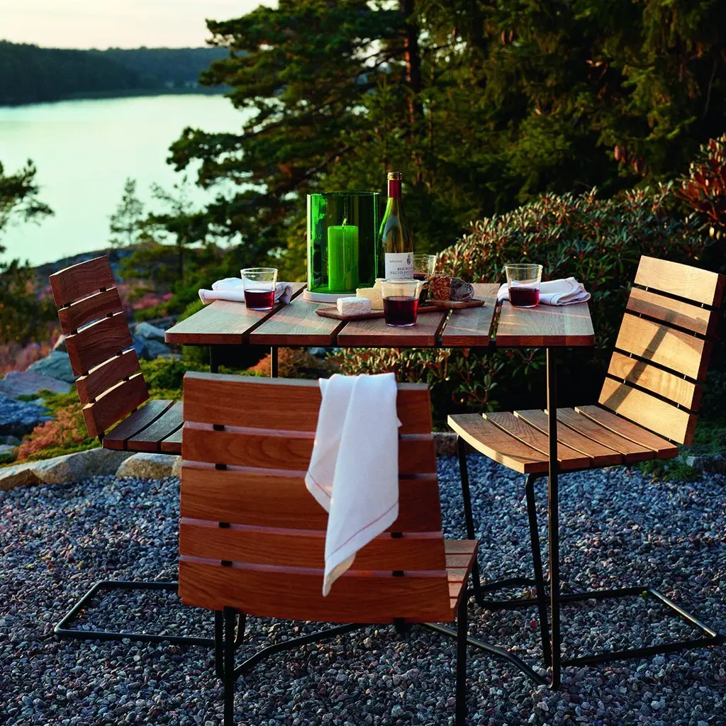 Grinda dining furniture comes in teak with a black painted steel frame. Grinda dining furniture includes a side chair, armchair, a bench, and four different sizes of tables to decorate your balcony, veranda, deck, lawn or wherever you host your dinner parties. Although it has a minimalistic look, the spring steel frames of the chairs, as well as the gently curved wood in the seat, make it very comfortable. In the back, the wood is elegantly pierced by the steel frame.