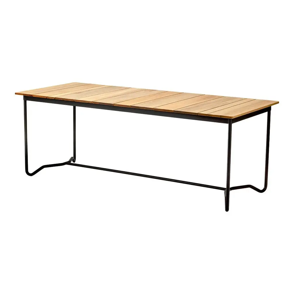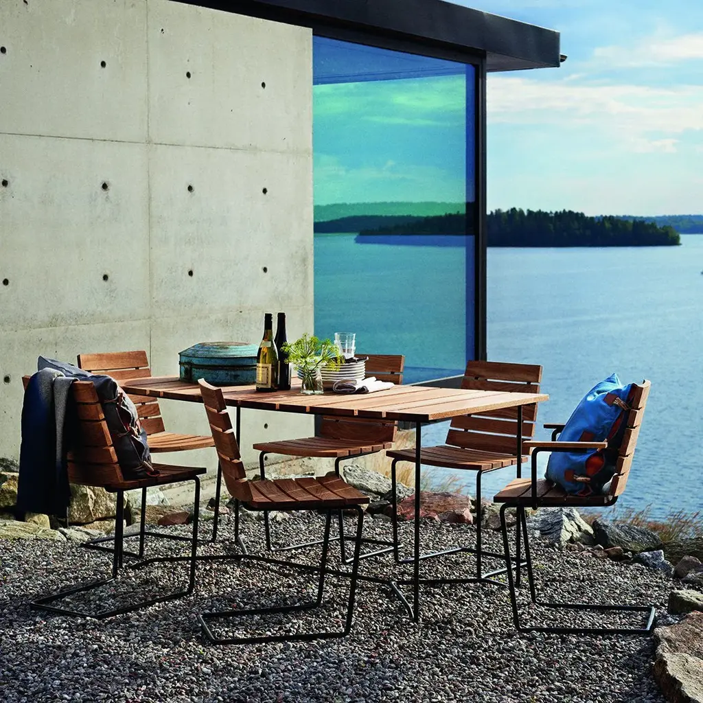 Grinda dining furniture comes in teak with a black painted steel frame. Grinda dining furniture includes a side chair, armchair, a bench, and four different sizes of tables to decorate your balcony, veranda, deck, lawn or wherever you host your dinner parties. Although it has a minimalistic look, the spring steel frames of the chairs, as well as the gently curved wood in the seat, make it very comfortable. In the back, the wood is elegantly pierced by the steel frame.
