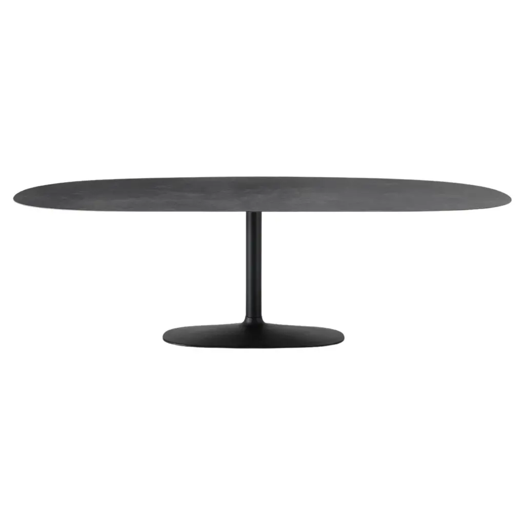 Designed with either a circular or elliptical top, the The Gubi 2.0 Dining Table fosters intimate gatherings, whether for dining, meetings, or casual socializing. The design team at Gubi drew inspiration from the concept of circles intersecting, resulting in a piece that emphasizes connection and fluidity. Its minimalist design, clean lines, and robust material options—ranging from luxurious marbles to warm wood finishes—offer a broad range of styling possibilities. Available in 3 sizes with base options of black or brass.