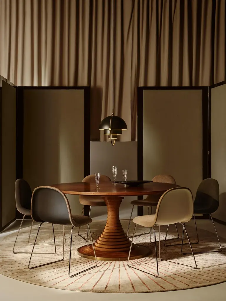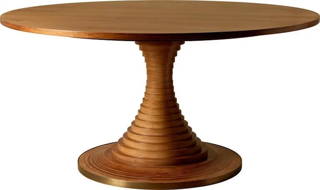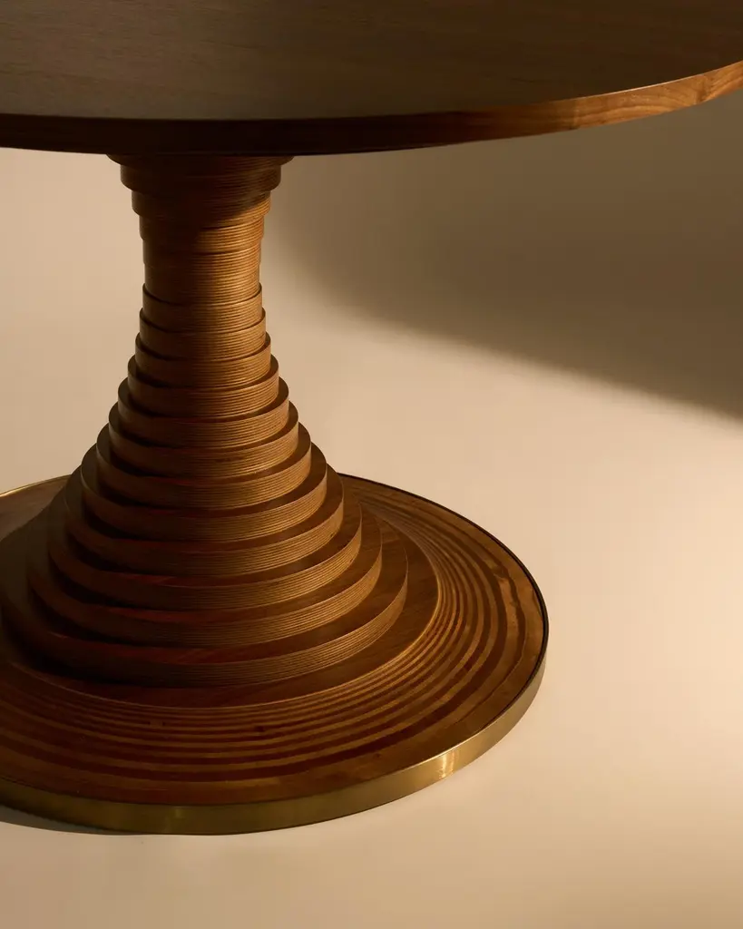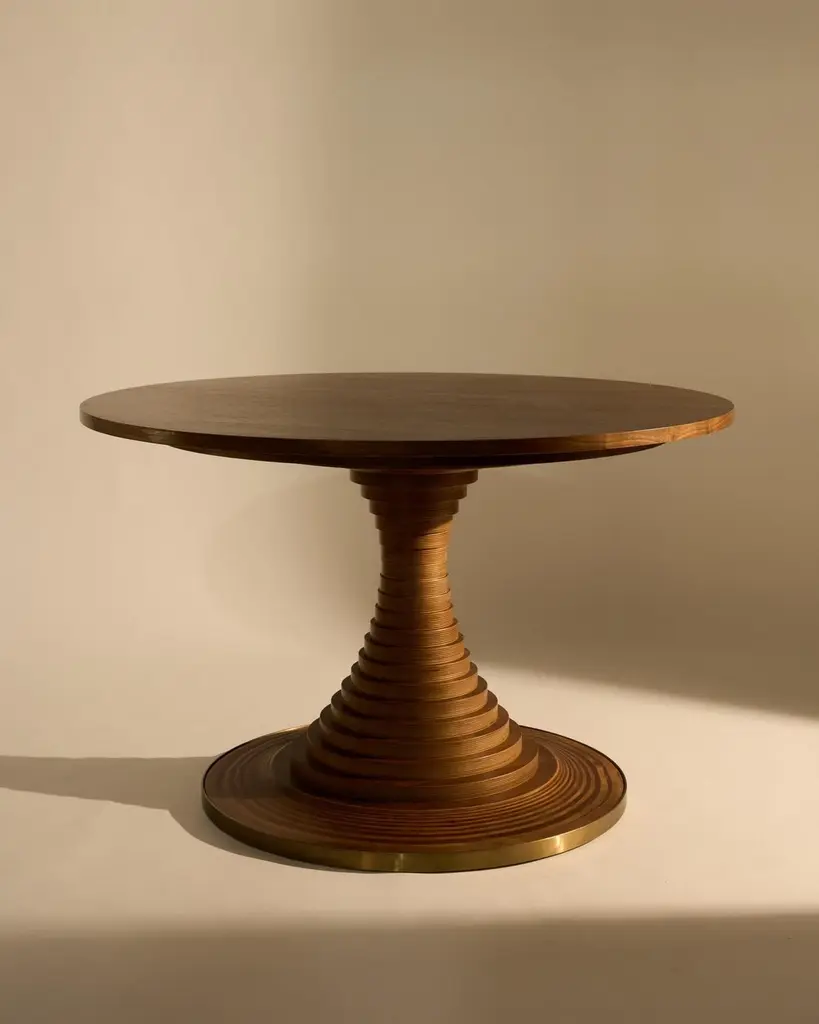 Designed in 1963 by the influential Italian architect Carlo De Carli, the Tavolo a Dischi diningtable is an elegant marriage of function and form, combining structural innovation, expressivemateriality, and practical excellence. The round table is ingeniously constructed from 3cm-thick walnut-veneer, birch plywood discs and a tabletop in matching walnut veneer, all madefrom FSC®-certified wood and wood from other responsible sources (FSC® C176589).Varying in diameter, the discs are stacked around a concealed metal core to form an elegantcurve that supports the generous tabletop. A burnished brass-toned steel band at the baseadds material contrast while providing protection. Available in two sizes, the Tavolo a Dischiis equally suited to dining, meetings, or gatherings — a centerpiece that brings people to-gether, fostering connection and conversation.