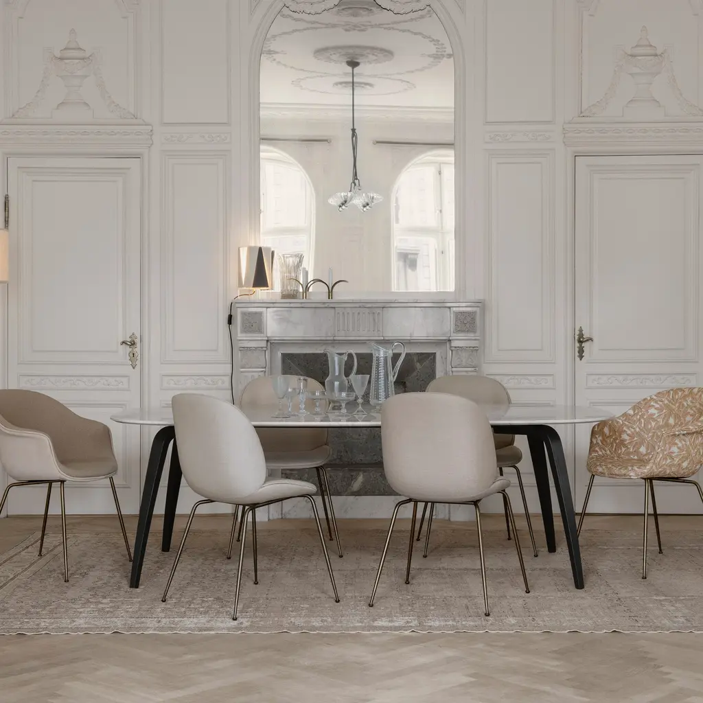 A rich marble surface gives a chic edge to Gubi’s refined wood dining table. The lasting beauty of Nordic craftsmanship is evident in the generous elliptical tabletop and lightly curved wooden legs. Quietly versatile, design studio Komplot’s table accommodates a range of accompanying seating choices while making an indelible statement all its own.