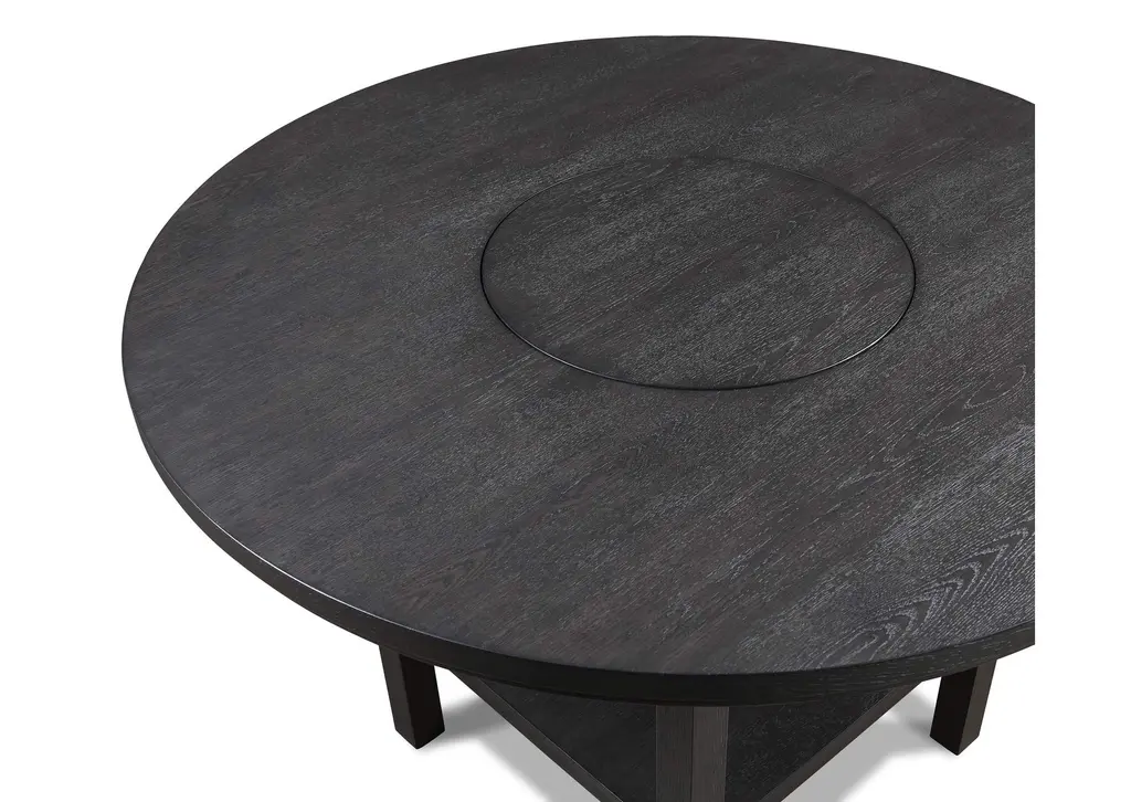 Elevate your dining experience with this contemporary dining group, where modern design meets rustic charm. Crafted with a rich, dark finish, the round table offers a built in turntable and an open shelf below. The subtle grain detailing on the table's surface adds depth and character. Complementing the table are the sleek, slat-back chairs, designed for comfort and style with their plush upholstered seats. Weight 114.400 lbs. (51.48kgs.)