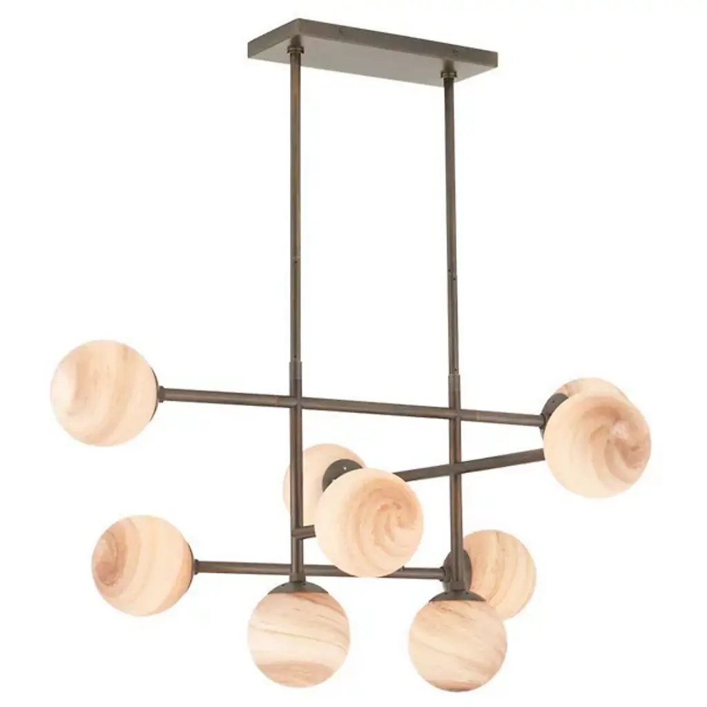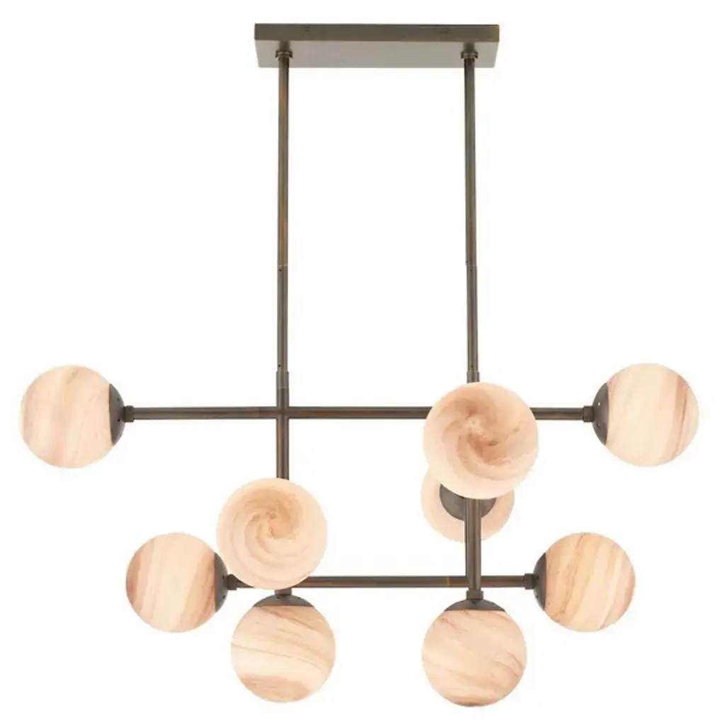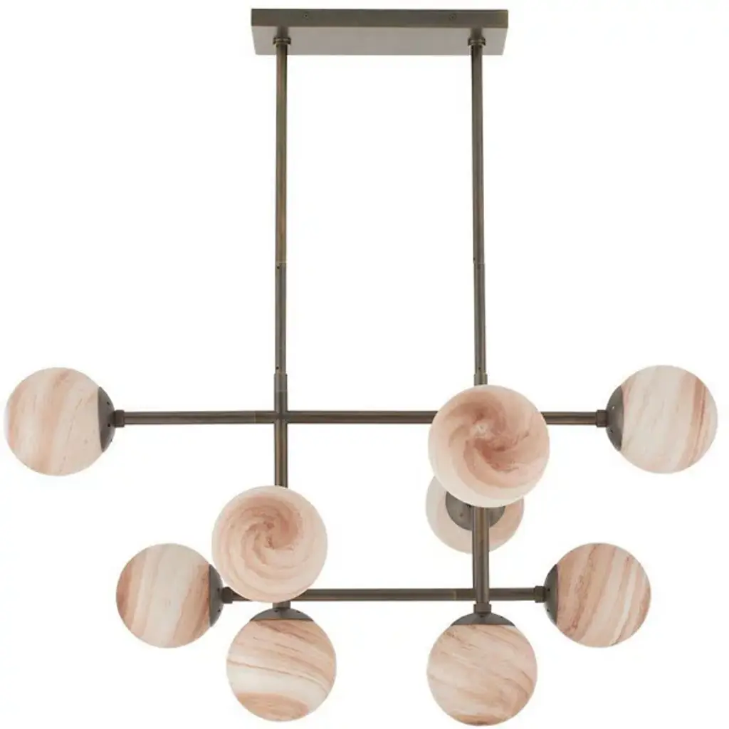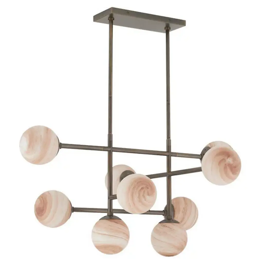 The Hadden Linear Suspension from Arteriors creates a galactic display with nine matte coffee swirl glass orbs. Each sphere perches within the gridded bronze-plated steel framework, becoming its own miniature light source. The rectangular layout allows for an expansive spread of illumination across dining tables and kitchen islands. This suspension adapts beautifully to both residential and commercial spaces, with its dimmable lighting system offering precise control. The damp rating makes it a practical choice for covered outdoor areas.