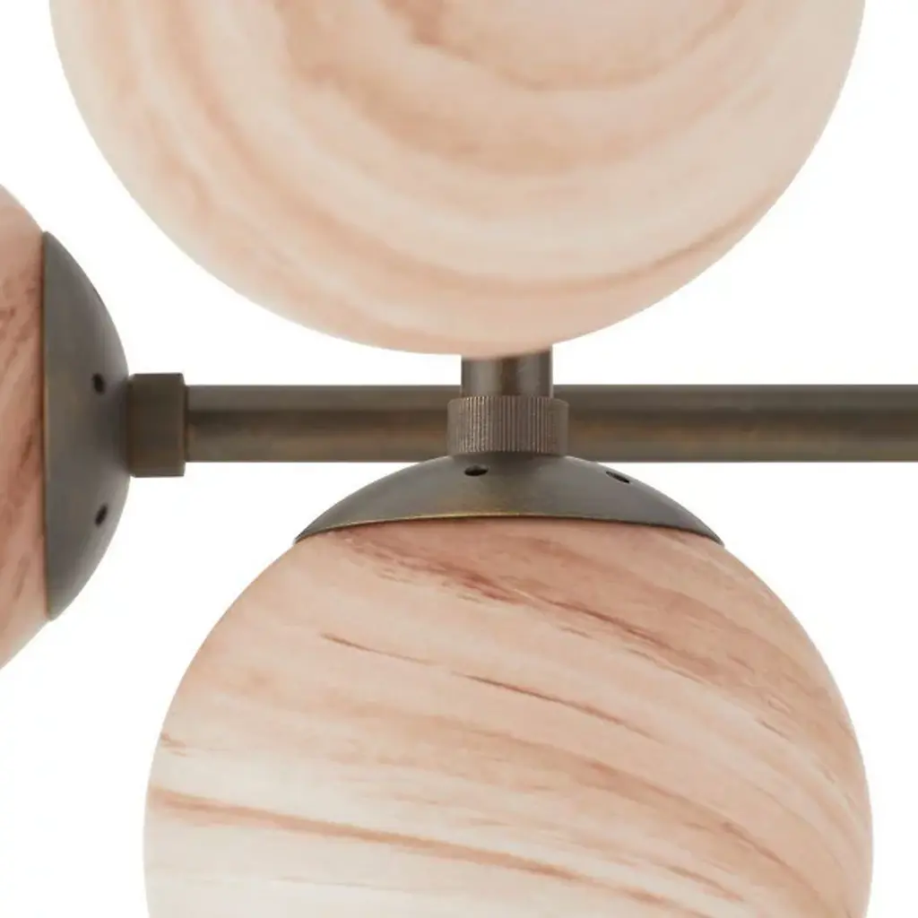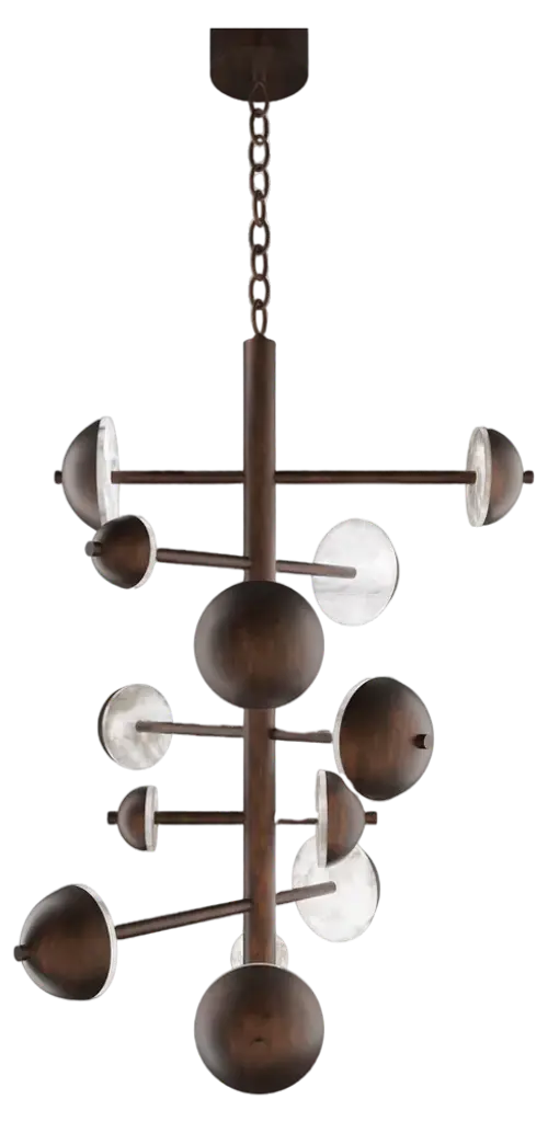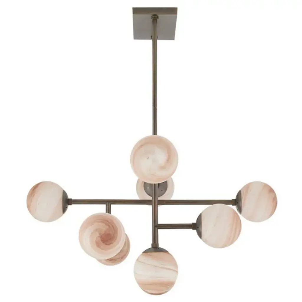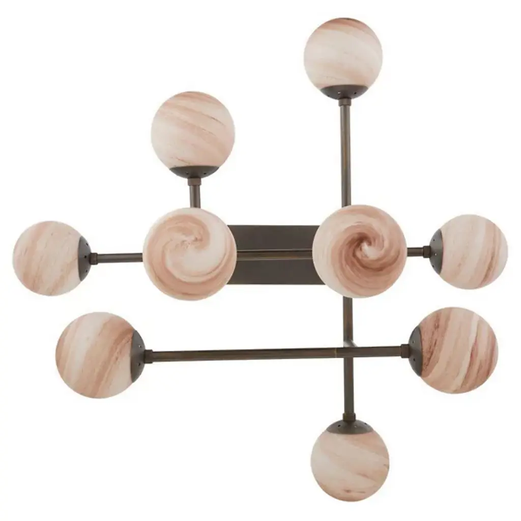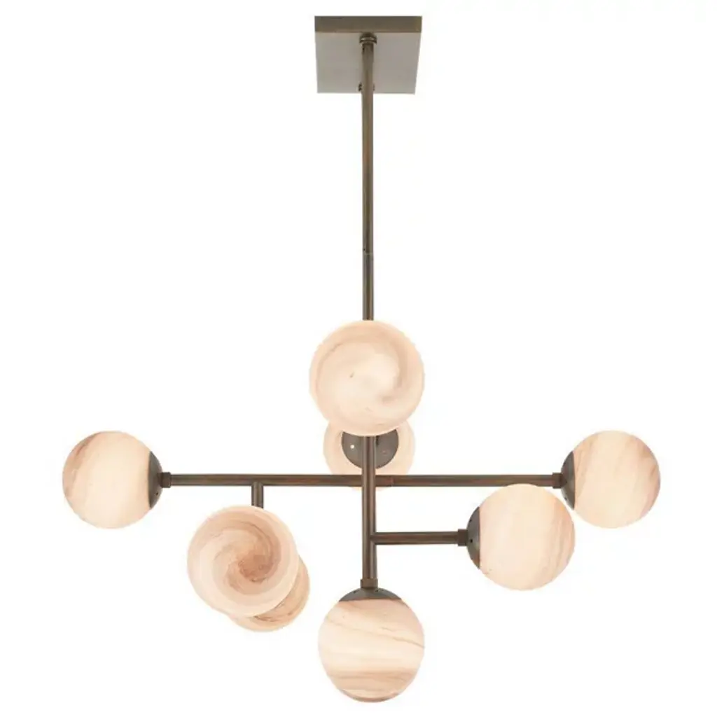 The Hadden Linear Suspension from Arteriors creates a galactic display with nine matte coffee swirl glass orbs. Each sphere perches within the gridded bronze-plated steel framework, becoming its own miniature light source. The rectangular layout allows for an expansive spread of illumination across dining tables and kitchen islands. This suspension adapts beautifully to both residential and commercial spaces, with its dimmable lighting system offering precise control. The damp rating makes it a practical choice for covered outdoor areas.