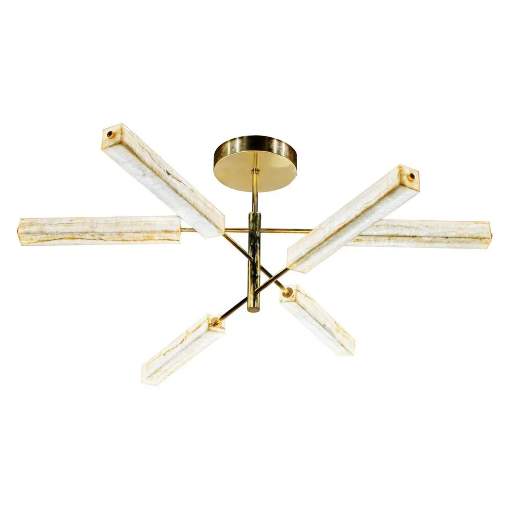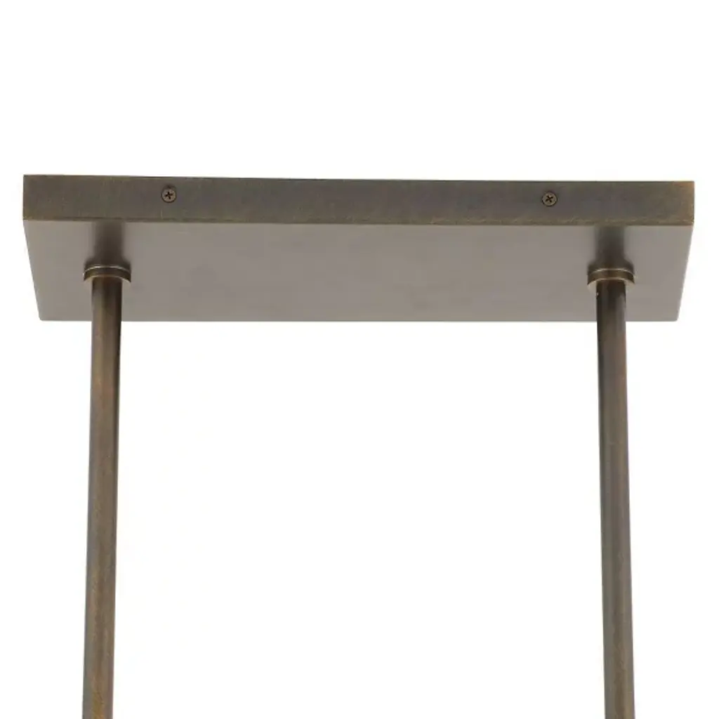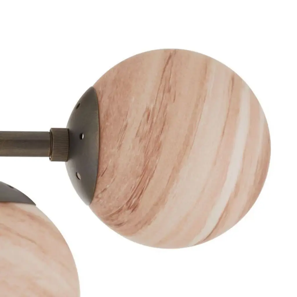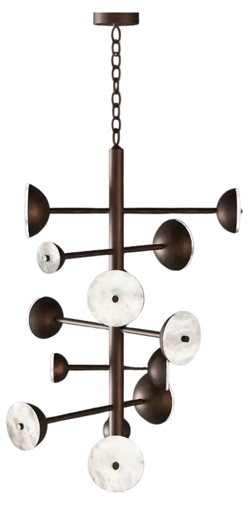 The Hadden Linear Suspension from Arteriors creates a galactic display with nine matte coffee swirl glass orbs. Each sphere perches within the gridded bronze-plated steel framework, becoming its own miniature light source. The rectangular layout allows for an expansive spread of illumination across dining tables and kitchen islands. This suspension adapts beautifully to both residential and commercial spaces, with its dimmable lighting system offering precise control. The damp rating makes it a practical choice for covered outdoor areas.