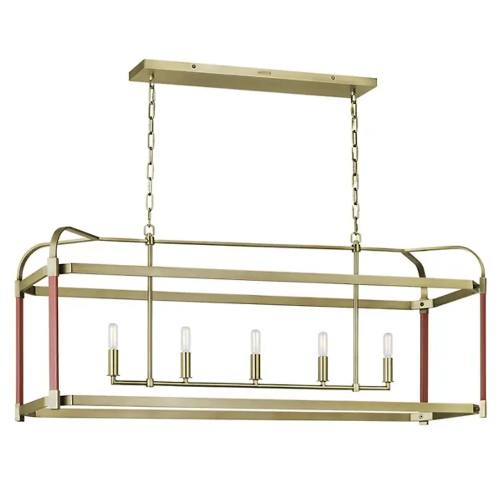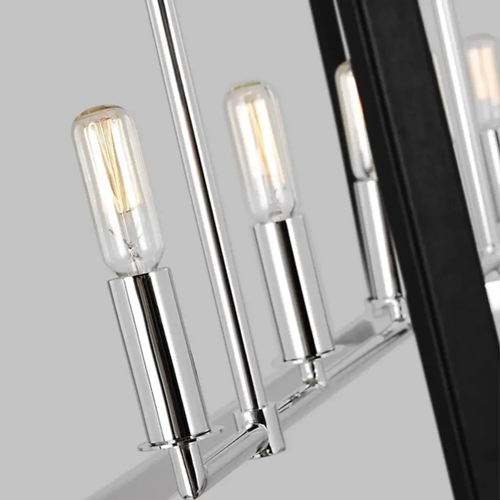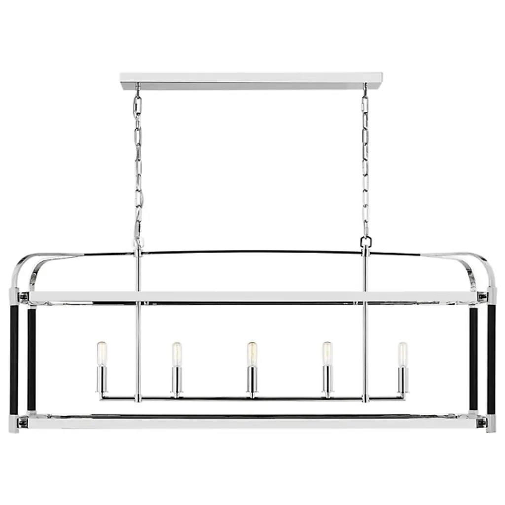 The Hadley Linear Suspension from Visual Comfort Studio extends the distinctive leather-accented design concept to longer dining tables and kitchen islands. Steel structural elements create a strong horizontal presence that organizes the space below without overwhelming it. Leather binding details at connection points introduce an unexpected textural element that breaks up the metal framework. This linear chandelier distributes light evenly across its full length, eliminating dark spots and ensuring consistent dining and food preparation illumination. Its adaptable aesthetic complements both traditional and contemporary spaces with equal success.