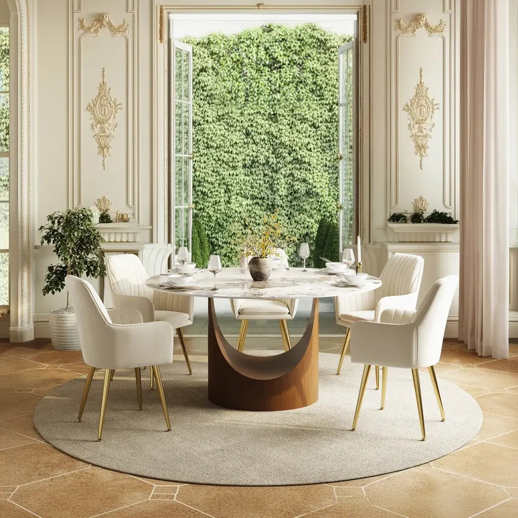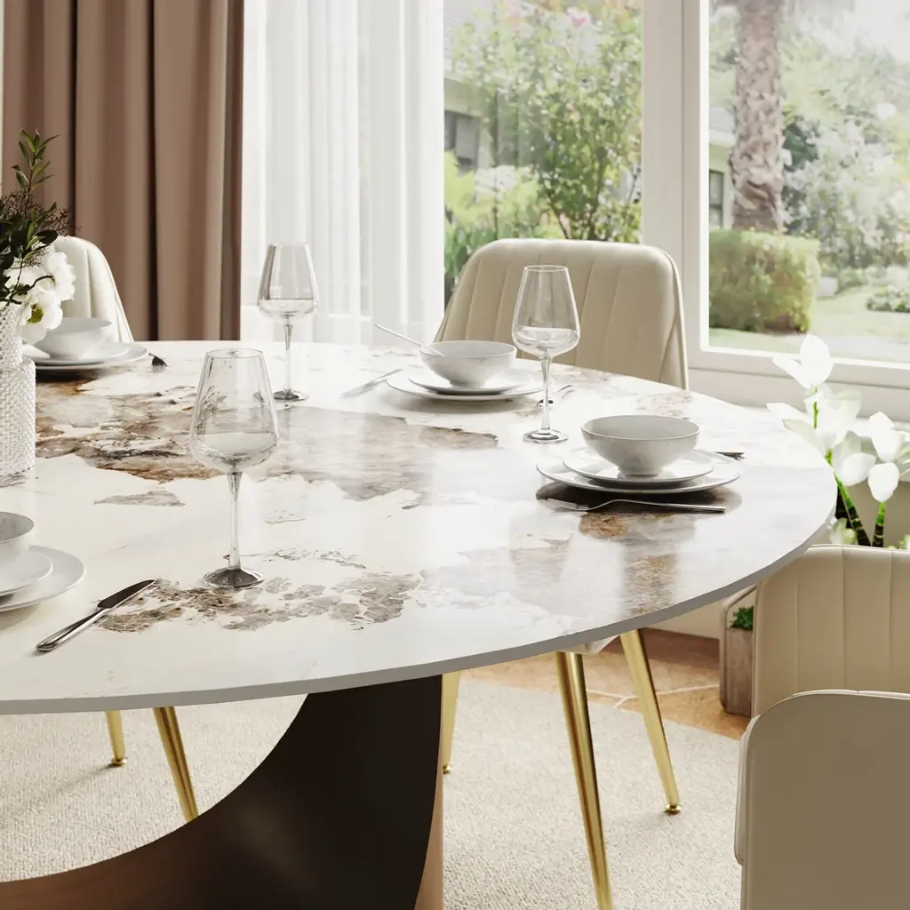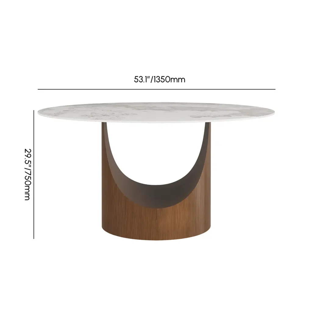 This 53.1" modern dining table features an ultra-dense sintered stone top with rich veining, resistant to heat, stains and scratches. Its sculptural U-shaped brushed stainless steel base offers both striking design and exceptional stability, bringing timeless elegance to your dining space.