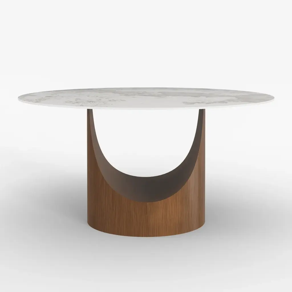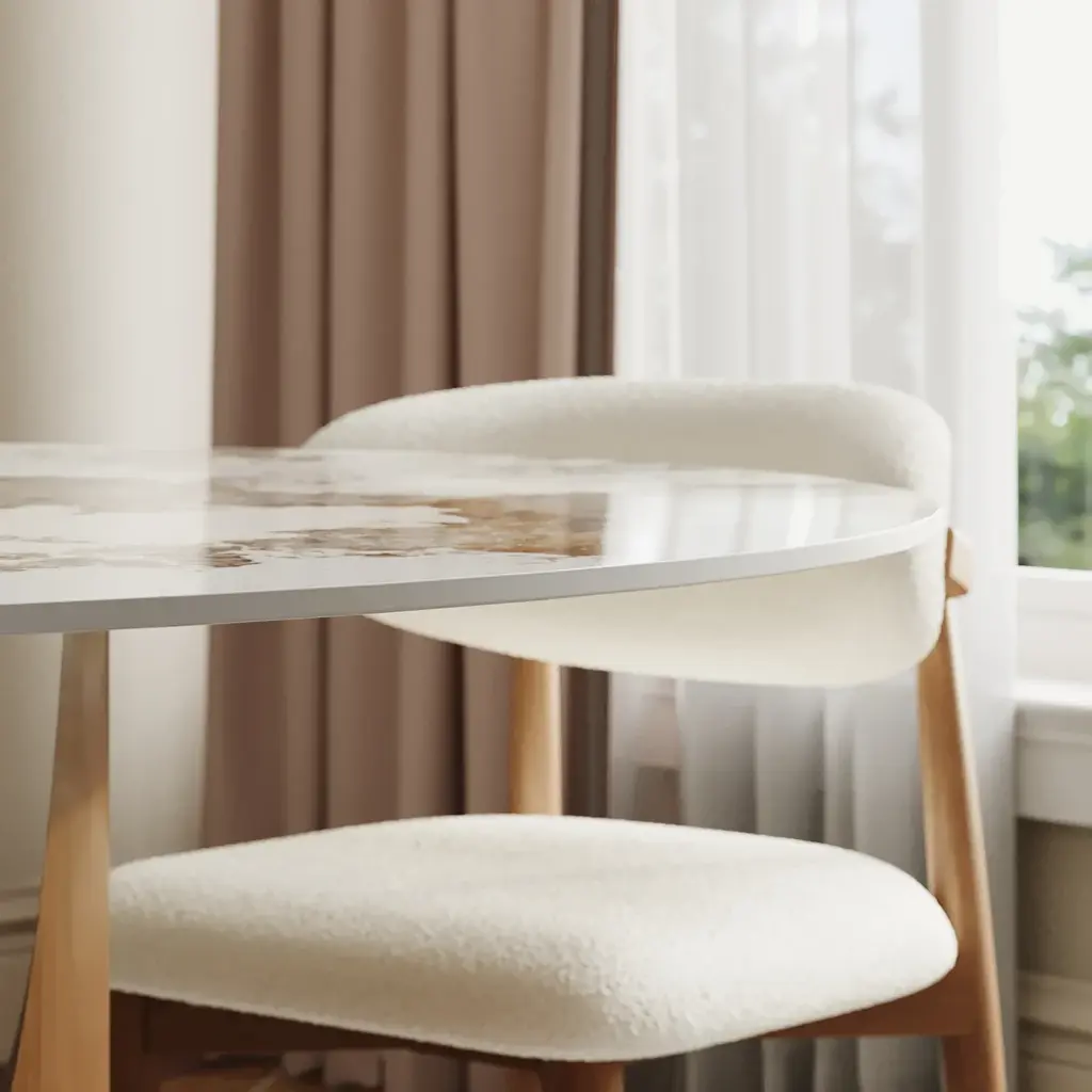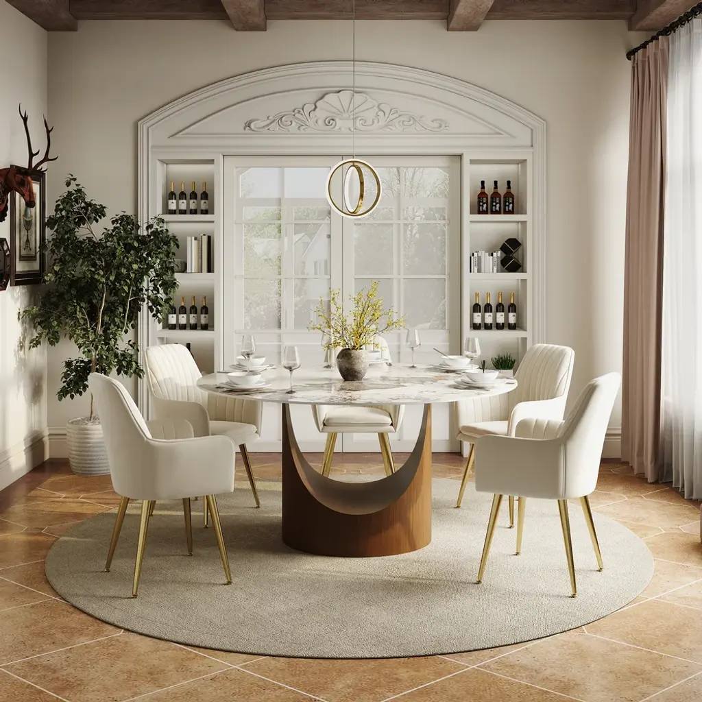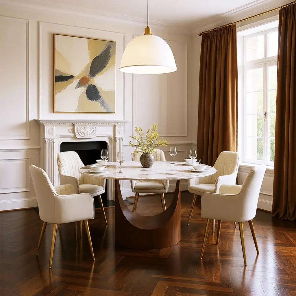 This 53.1" modern dining table features an ultra-dense sintered stone top with rich veining, resistant to heat, stains and scratches. Its sculptural U-shaped brushed stainless steel base offers both striking design and exceptional stability, bringing timeless elegance to your dining space.