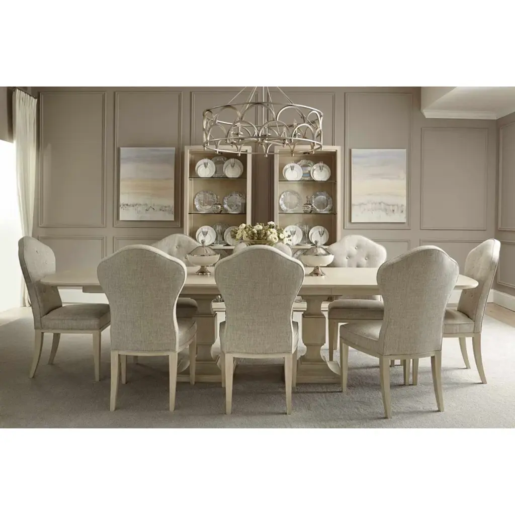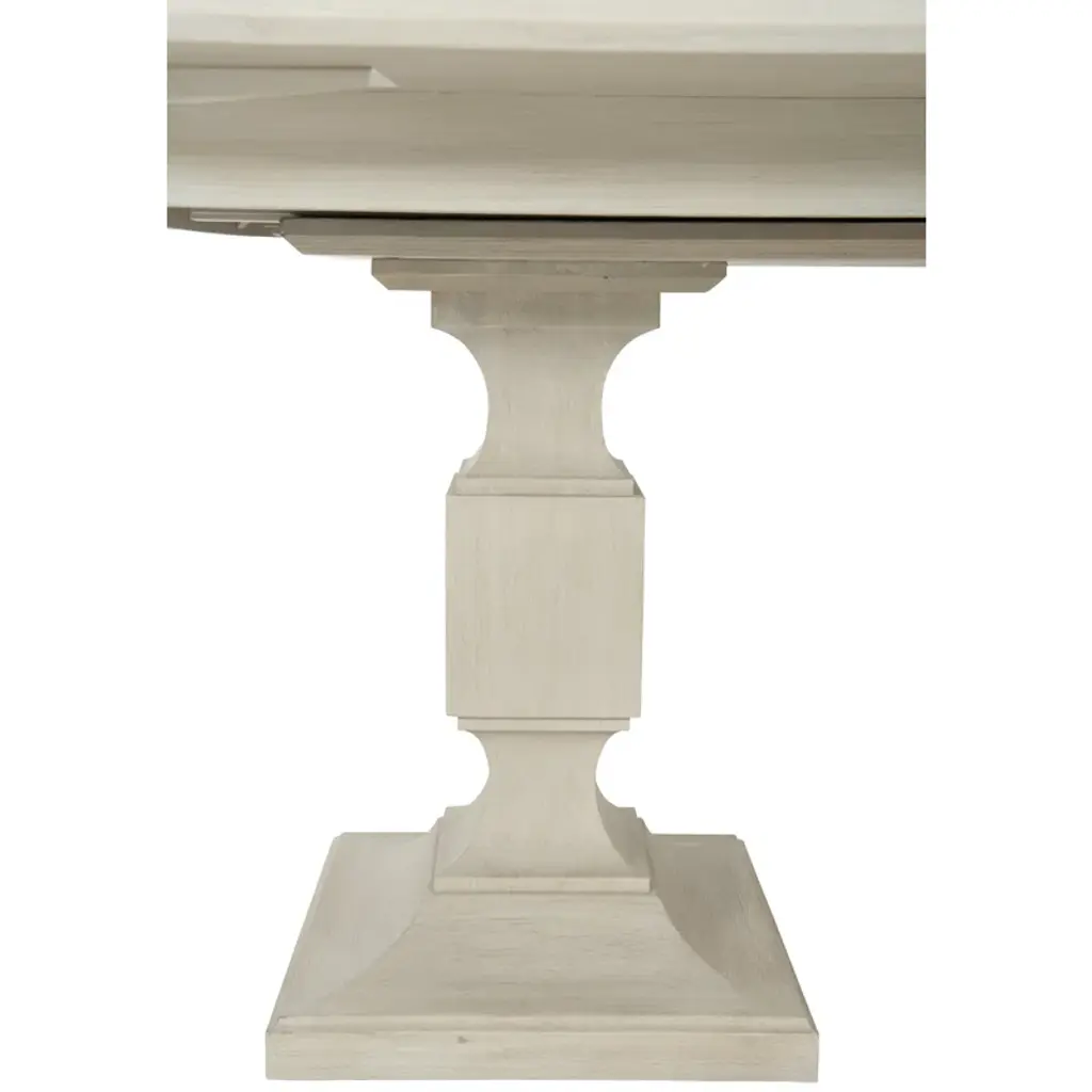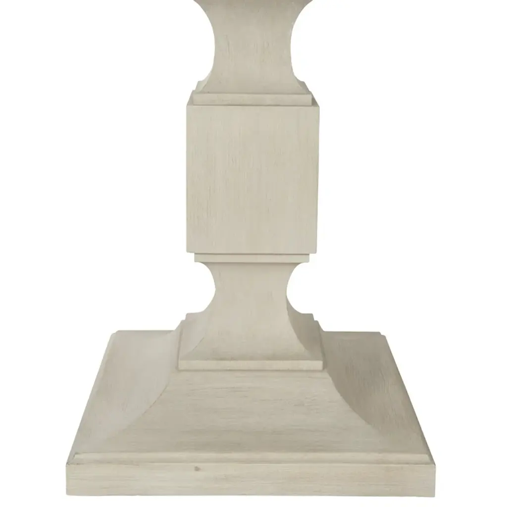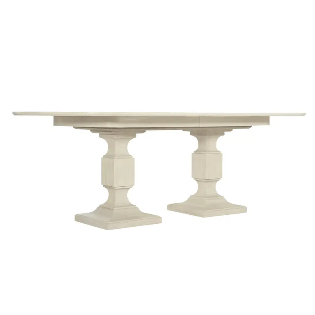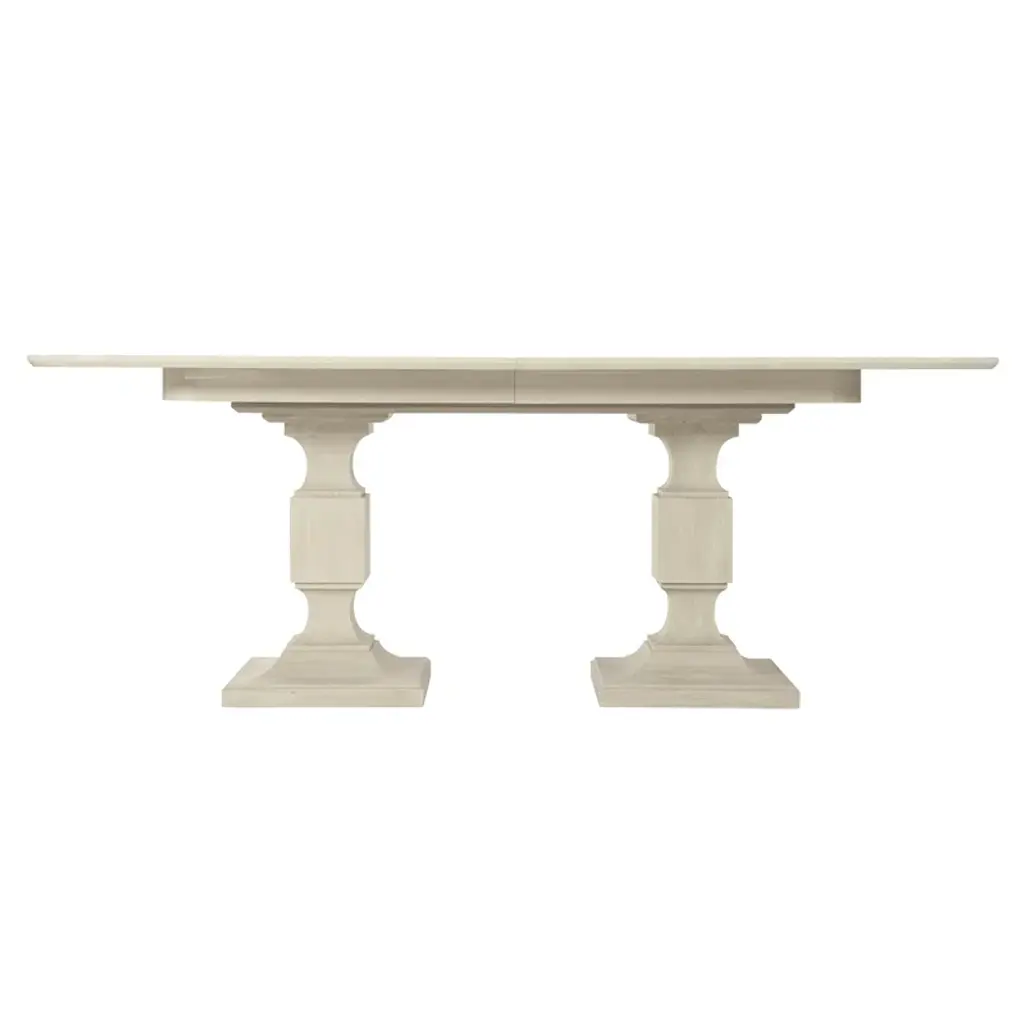 This all-wood East Hampton dining table is designed for versatility. While perfect for an intimate space, its two-pedestal base and two 20” leaves allow it to extend to accommodate large groups. Its decorative cerused finish is created from a combination of different colored pigments to highlight the wood’s natural grain pattern, creating a distinct handmade, elegant look.