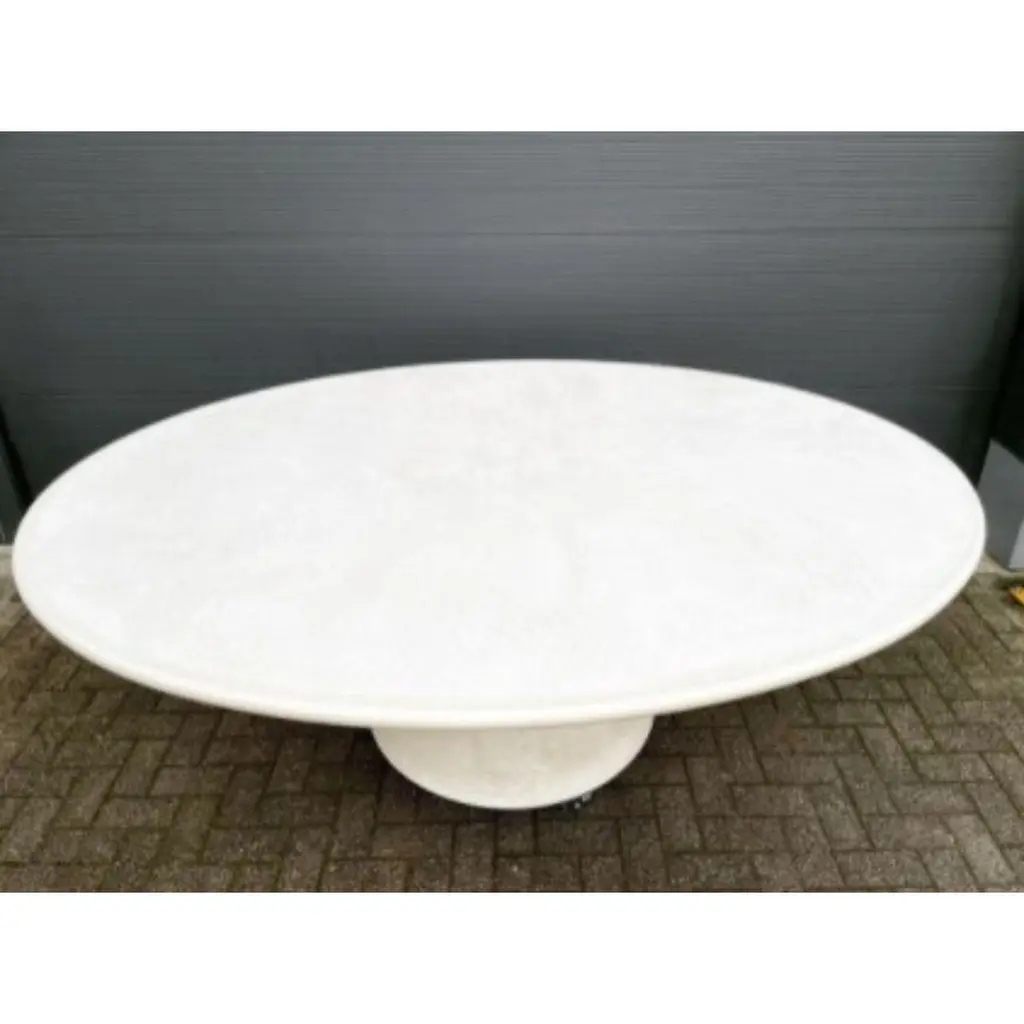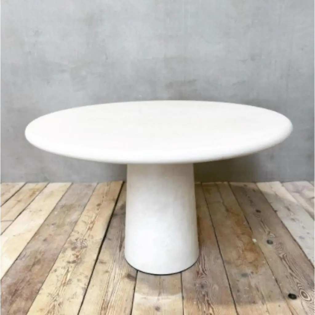 Handmade round outdoor dining table 120 by Philippe ColetteDimensions: Ø 120 foot diameter: 40 cmCustomized heightMaterials: Mineral lime plaster.All shapes / sizes can be customized. Wide range of colors.Our tables are in mineral lime plaster, unlike mortex, they are very natural, not artificial (plastic like mortex).The tables are 100% stain and acid resistant and maintenance free.100% artisanal tables 'made in Belgium'.