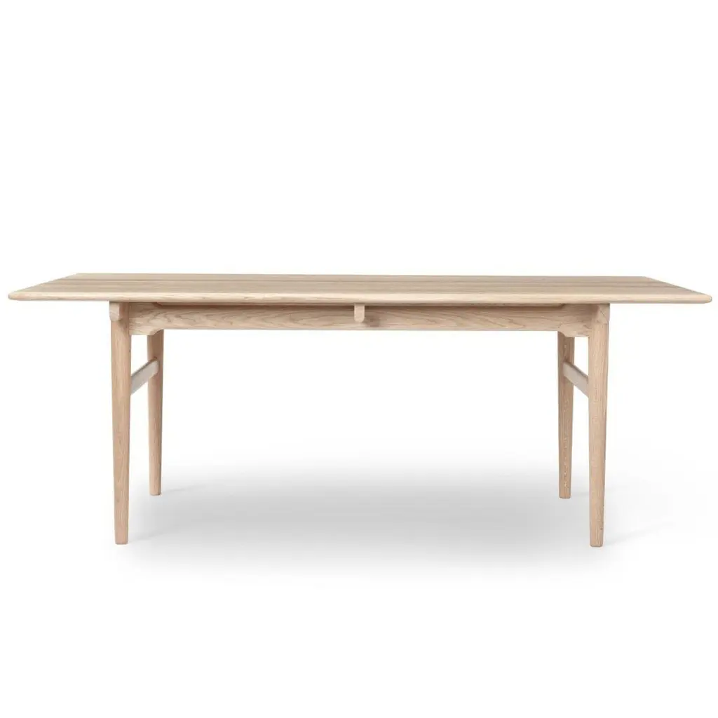 Hans J. Wegner 'CH327' Dining Table in Oak and Soap for Carl Hansen & SonThe story of Danish Modern begins in 1908 when Carl Hansen opened his first workshop. His firm commitment to beauty, comfort, refinement, and craftsmanship is evident in iconic pieces designed by such legends as Hans J. Wegner, Arne Jacobsen, Kaare Klint, Poul Kjærholm, Vilhelm Lauritzen and others. Now in its third generation as a family run business, Carl Hansen & Son maintains its legacy through skillful work with the highest quality materials, sustainably producing Danish design classics by past icons and influential new designers.Originally designed in 1962 by legendary creator Hans J. Wegner, the 'CH327' table appears to float above the frame courtesy of wonderfully tapered edges which add to this table's appeal. Smooth clean lines express a delicate yet confident piece resulting in an alluring table fit for the office or home. The completed design highlights the core of Wegner's legacy, showcasing the inner soul of furniture pieces through a simple and functional exterior. Executed in oak and a soap finish. Accommodates 1 or 2 MDF black end leaves (not included) that are available for an additional cost. Please inquire when ordering. Price per item. Available in unlimited quantities in choice of oak, beech, walnut, teak/oak or walnut/oak wood, with finishes in soap, lacquer, oil or white oil. The tea/oak has a table top in teak with an oak base and the walnut/oak has a table top in walnut with an oak base. This listing is for the 'CH327' table in oak and soap finish. In stock lead time 2-3 weeks, out of stock lead times can add an additional 8 weeks or more. Please note that lead times, inventory availability and cost are subject to change without notice and dependent on choice of wood, finish and material ordered. For time sensitive orders, please contact us for current lead times prior to purchasing. Made to order. All sales are final.