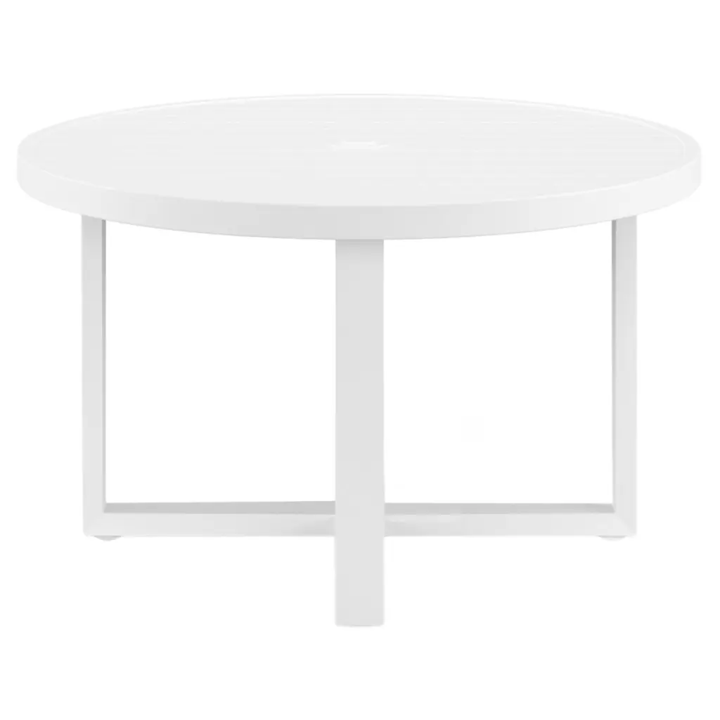 The Harlyn Round Dining Table blends modern and industrial sensibility into one striking design, featuring a slatted table top and sled base, crafted in powder coated aluminum. This versatile table is perfect for accommodating gatherings of various sizes.