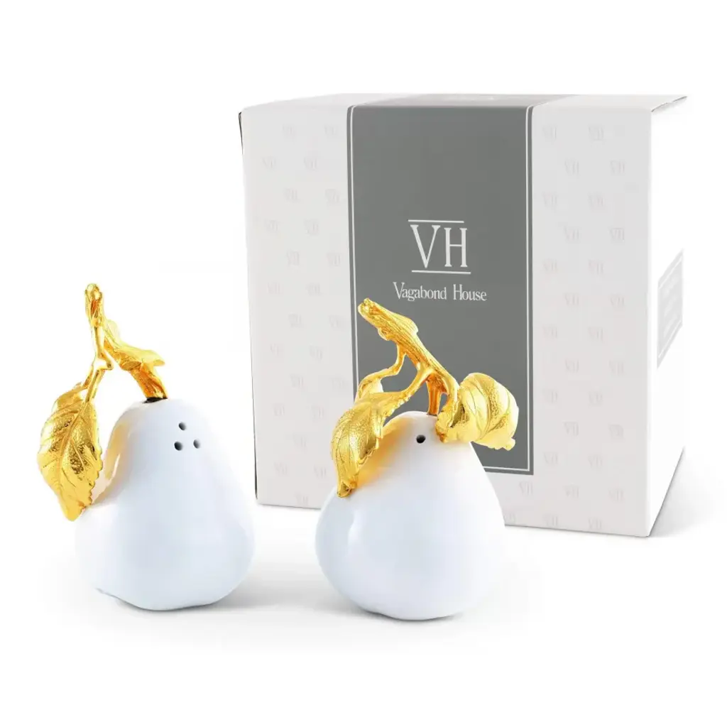 Enliven your table decor with this set of porcelain Vagabond House salt and pepper shakers. This luxurious pair features stunning pure white pear-shaped porcelain bodies with high-shine gold leaf tops, providing upscale contrast that fits right in with high-end dining room settings. The 2.5 x 2.5 x 3.75-inch sizing makes them easy for guests to grasp while dining, and strategically placed holes ensure salt and pepper comes out gently, preventing spillage and mishaps. Pair this elegant set with coordinating pear and leaf serving dishes and tableware to create a chic tablescape that showcases your eye for high-end design. Rely on the pristine white and luxe gold to help this opulent salt and pepper shaker set blend beautifully with numerous dining room color schemes for an easy fit in your space. Vagabond House is a family-owned American company specializing in fine pewter tableware, servingware and giftware. Largely inspired by nature, their exclusive products are designed to be unique, functional heirlooms for those who seek to express tradition and style in both family and formal entertaining.