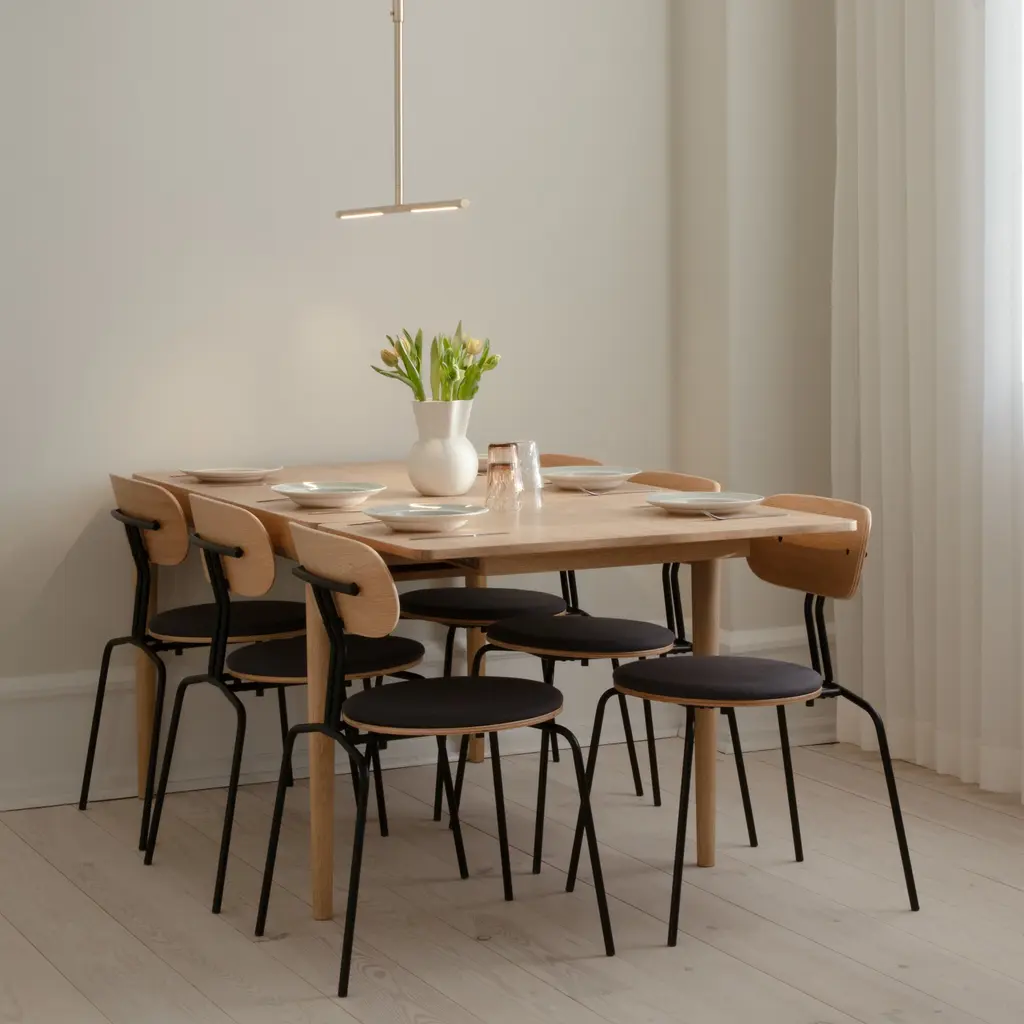 The Heart ’n’ Soul Dining Table features a slim, extendable design with two fabric-inlaid drawers at each end for convenient storage. Designed by Søren Ravn Christensen, known for his innovative approach to furniture design, the table is available in two sizes: a smaller version ideal for intimate gatherings and a larger one that seats up to 12 people. Both sizes are extendable, allowing you to create additional space for bigger dinners and cherished moments with loved ones. The table comes in oak, dark oak, and black oak finishes, with optional FENIX® nanolaminate tops in cloud grey, moss green, and obsidian black, offering exceptional durability and resistance to scratches, stains, and impact.