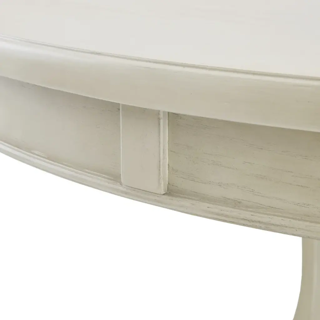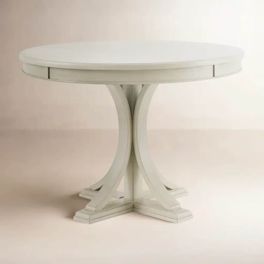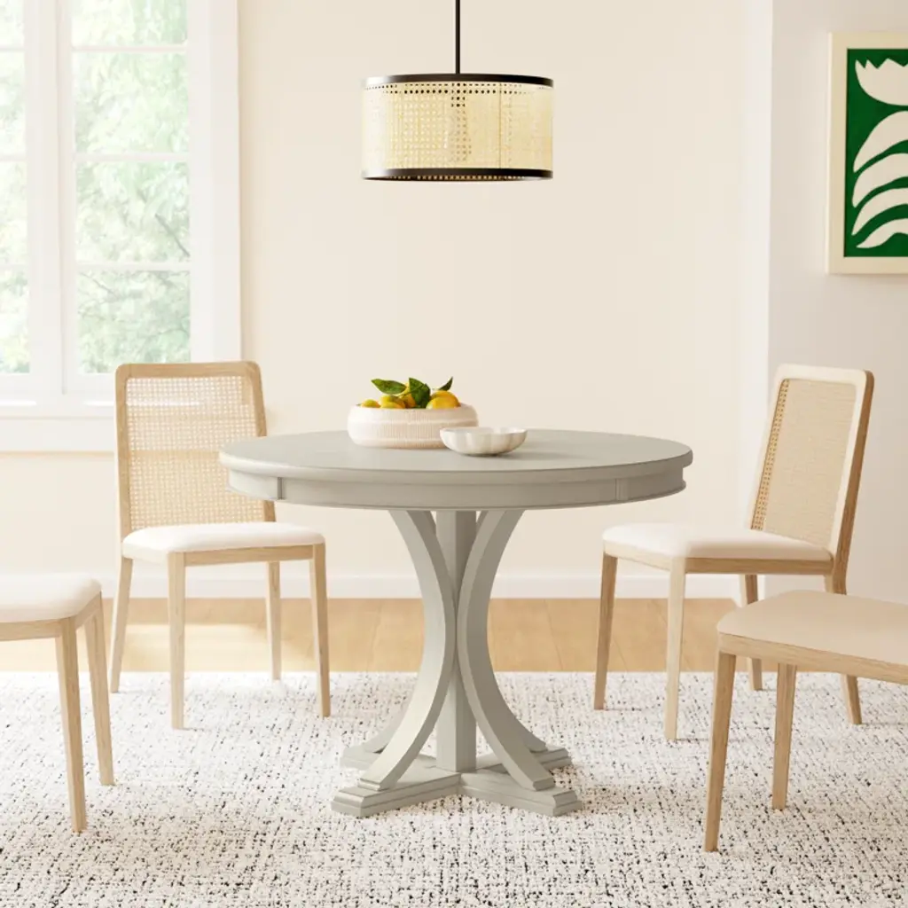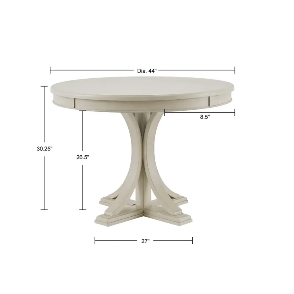 Gather around the round dining table. Featuring a cream or gray wood finish with distressed edge detail, this round dining table adds a subtle elegance to your kitchen. Assembly is required.