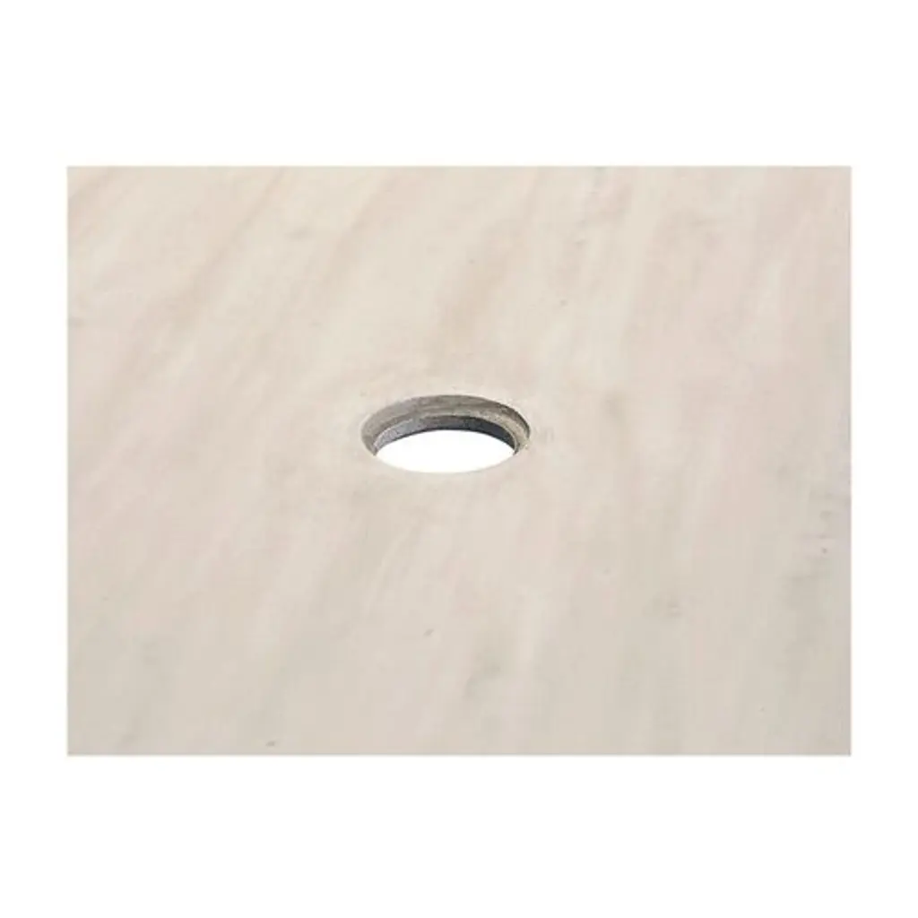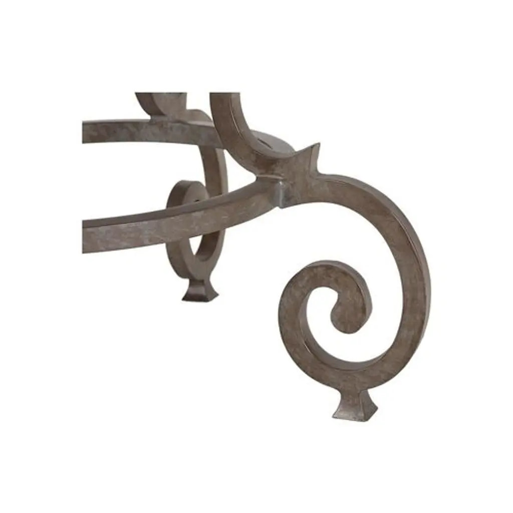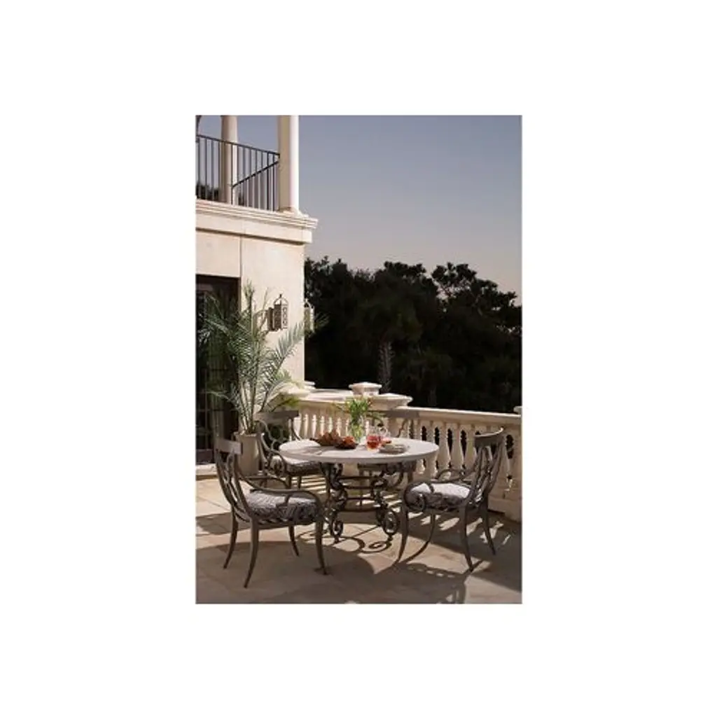 A stylish choice for enjoying meals al fresco, this round dining table is designed with a scrolled all-weather cast and wrought aluminum base and aluminum top in a powder coated faux travertine finish. Seats four to six.