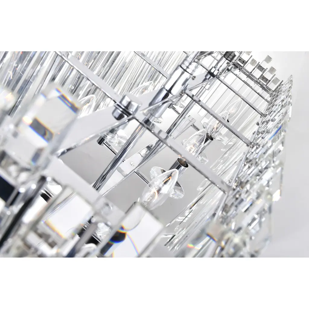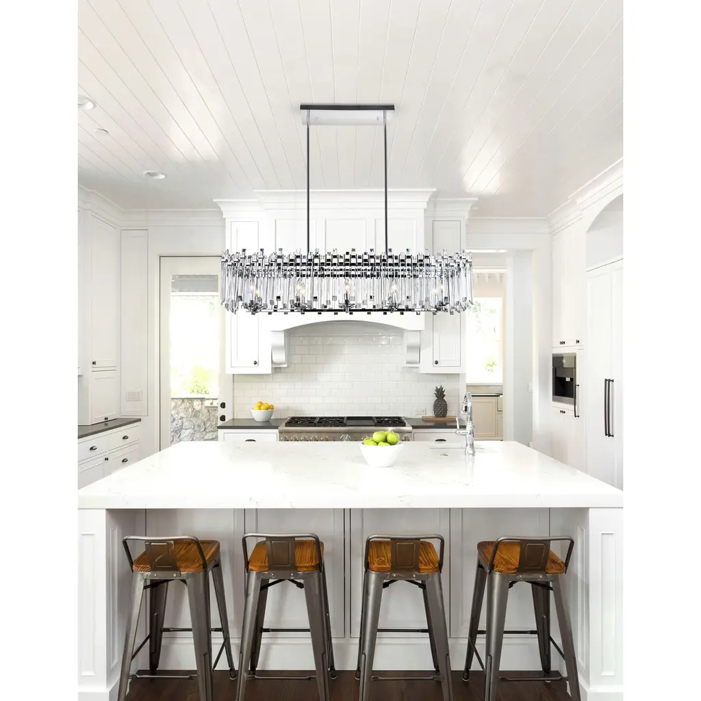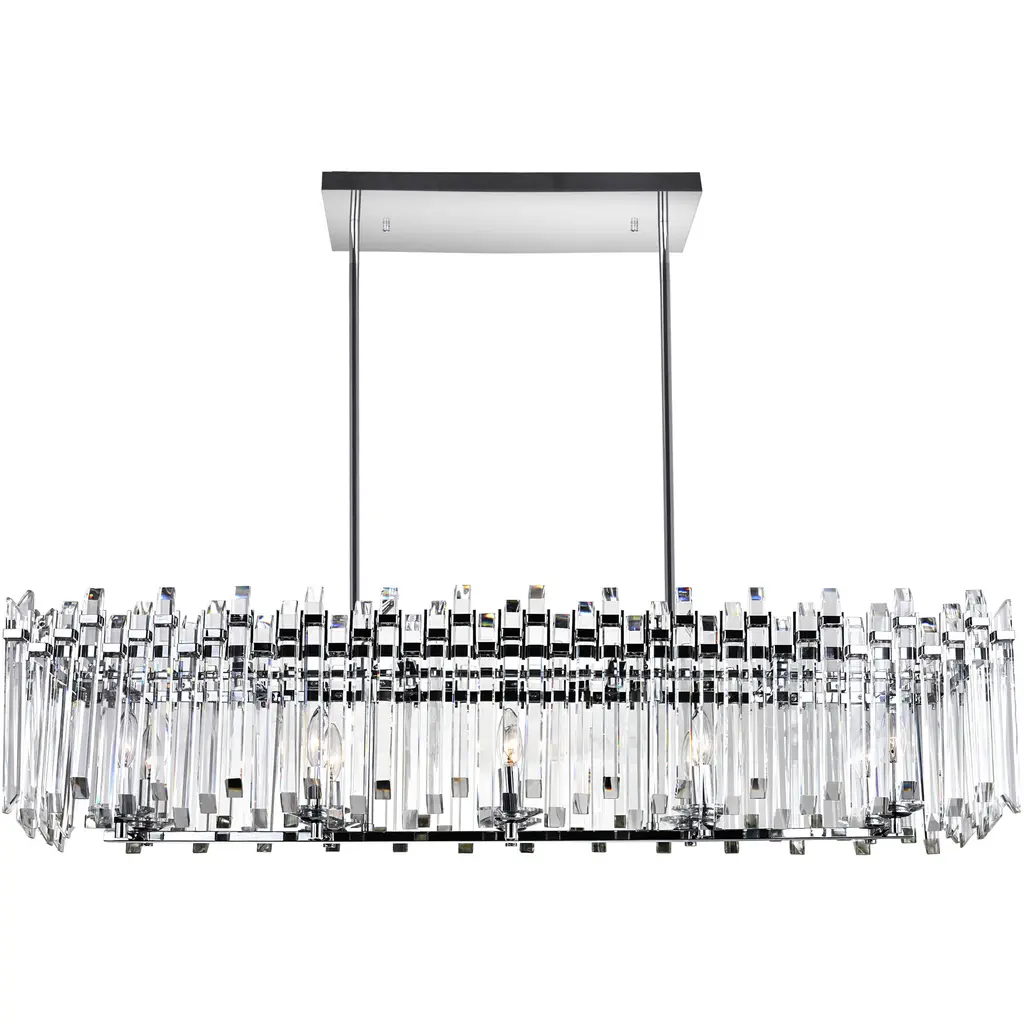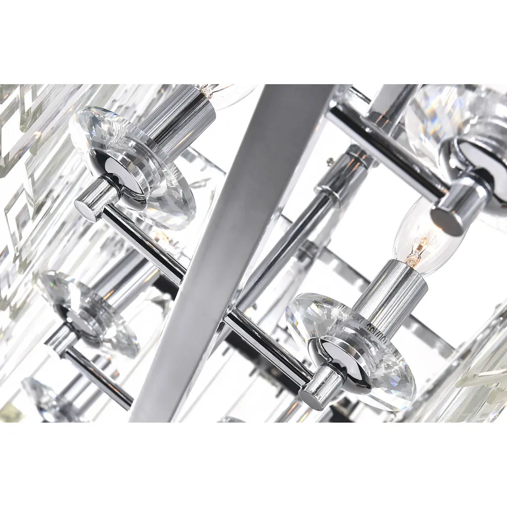 Add an unexpected layer of style to your space with the Henrietta 10 Light Chandelier. It features a cluster of slender clear crystals forming a rectangular shade. The inner metal base is a 10-bulb candelabra frame in a striking chrome finish. Lit from within, this glamorous light fixture provides a gentle yet glamorous glow perfect over a long dining table or a modern kitchen island.