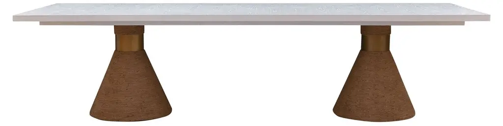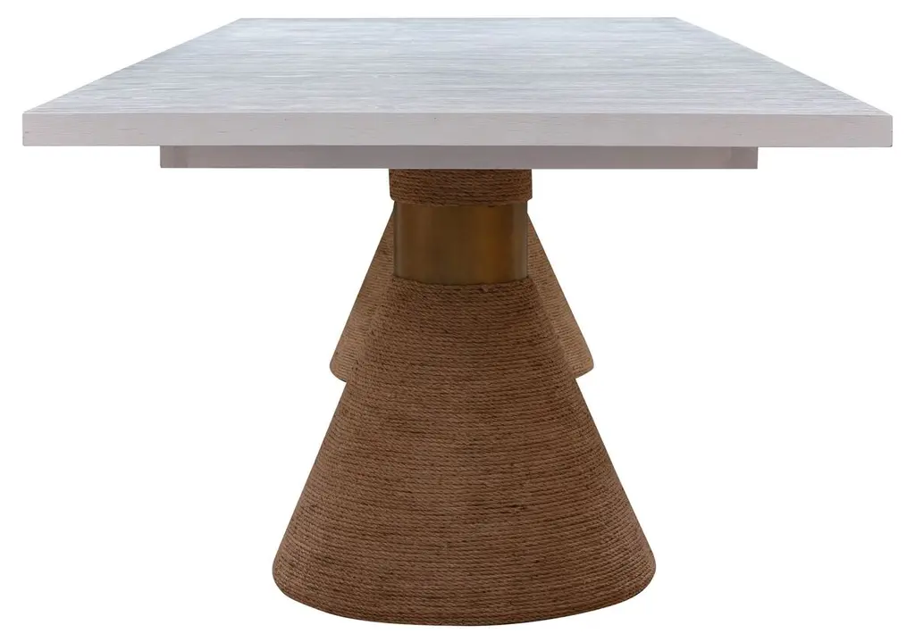 Rope wrapped around the conical legs brings a textural complement to the gently weathered acacia top of this handcrafted dining table. Ten feet wide, the table seats 10 people with room to spare.