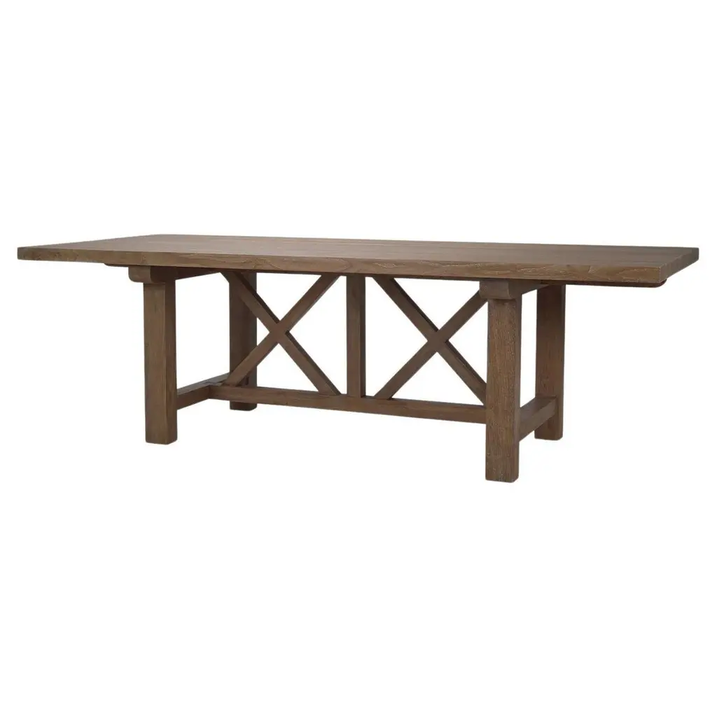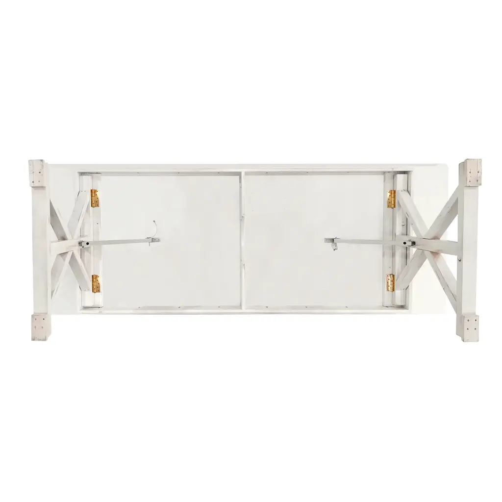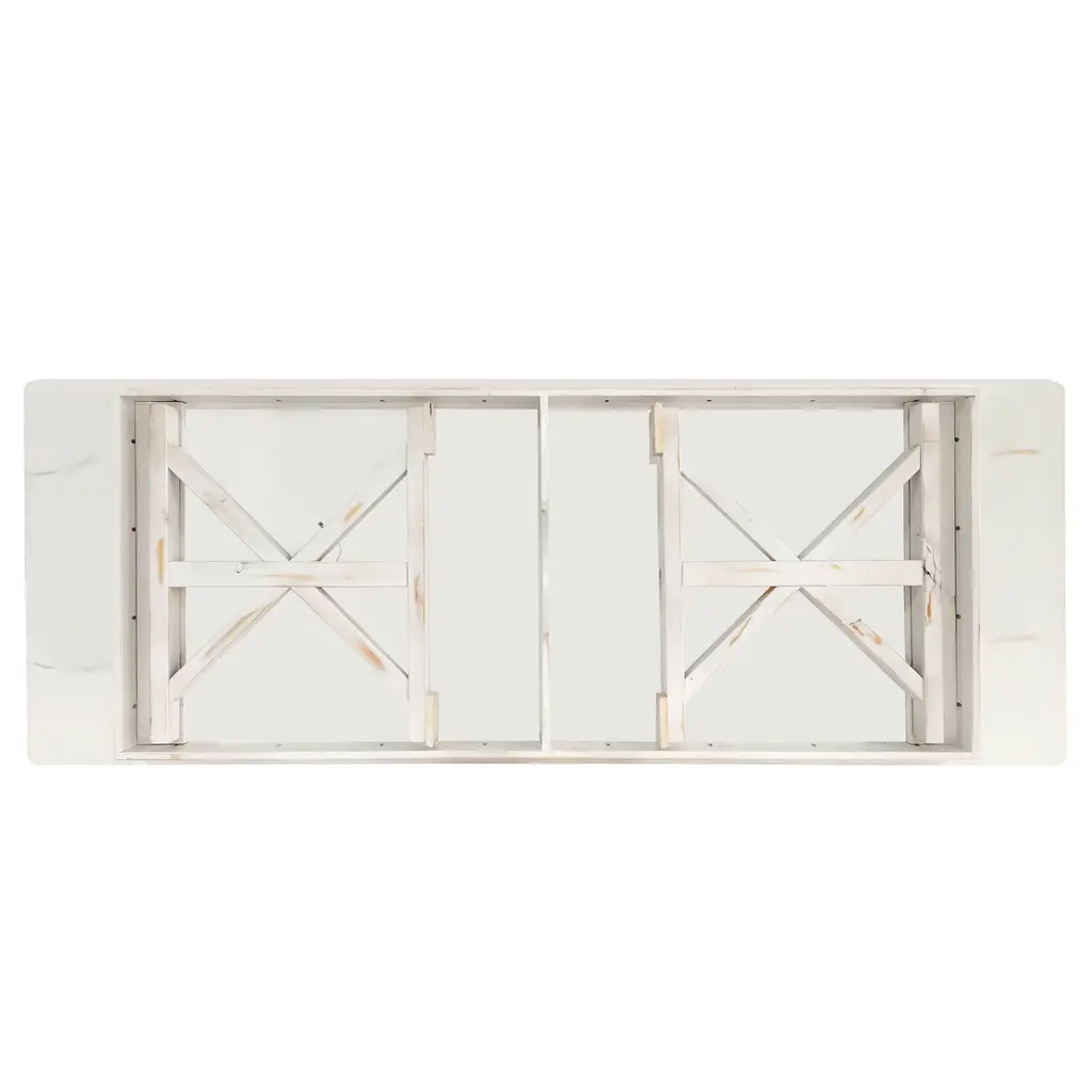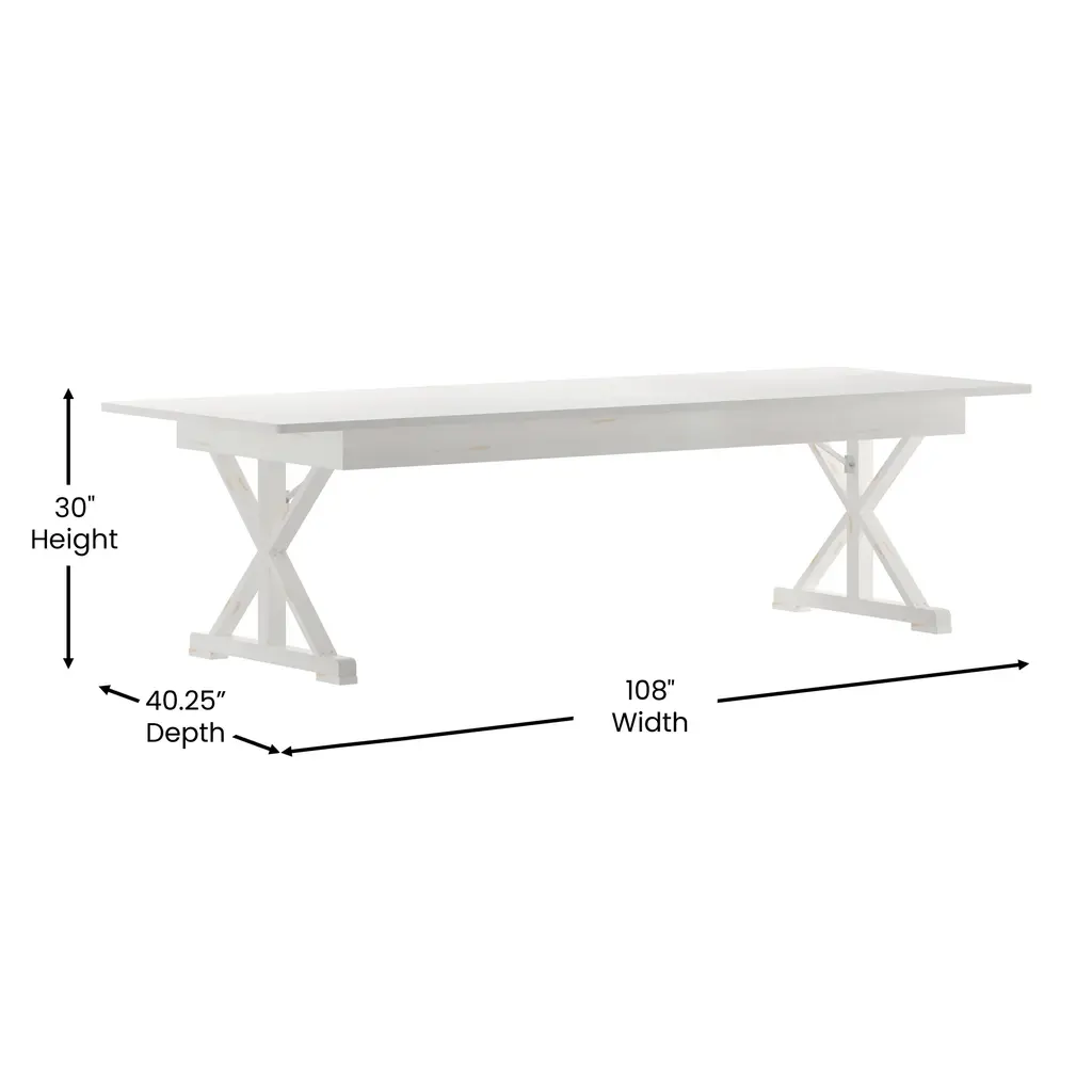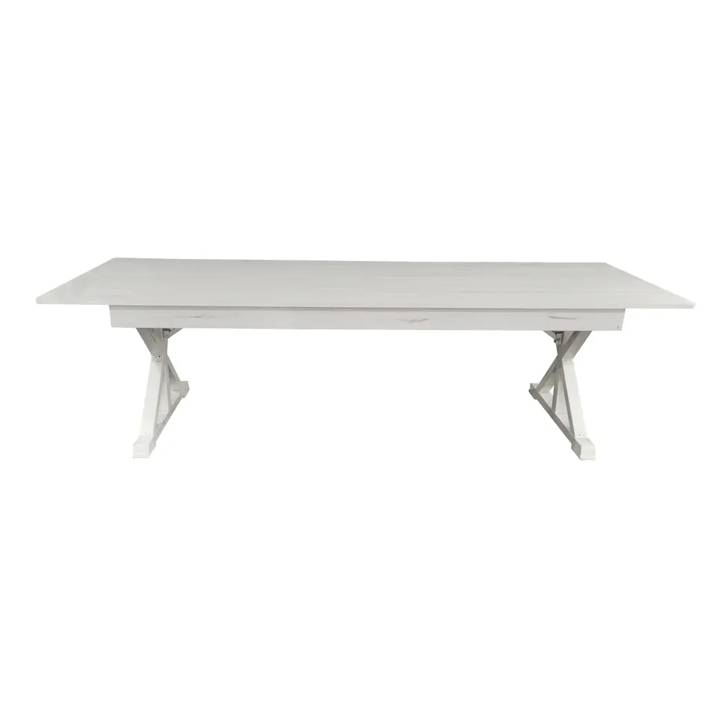 Introduce the warm, inviting aesthetic of farmhouse decor into your home or business venture with this 9' x 40" folding dining table with updated crisscross style legs. Boasting a .75" thick tabletop with a 4" apron comprised of solid pine and capable of supporting up to 880 lbs. static weight capacity, this stunning farm table seats up to 10 people and is suitable for daily use in restaurant and hospitality industries as well as busy households. The foldable design allows for easy movement if you want to set up outside for special events or family gatherings in favorable weather. Simply remove the security pins and fold the legs beneath the tabletop for transport. When you arrive at your desired location, unfold the legs and insert the security pins. The space-saving foldable legs also allow your to store these dining tables away until your next event or when complete flooring maintenance is needed. To maintain that just out of the box appearance, use a water based cleaner and follow-up with a dry cloth. Best of all, no assembly is needed so you can start using this fabulous table as soon as you receive it. Whether you're upgrading your commercial decor or creating a focal point in your home dining area, this farmhouse style dining table is sure to be a welcome addition to any space.