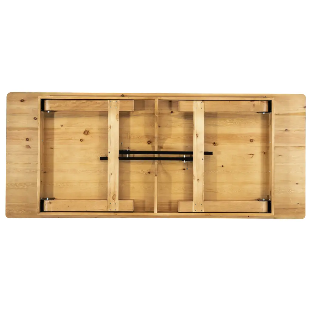 Set a stylish and rustic anchor in the heart of your home with this dining room table where family can come together for delicious food and great conversation. Accommodate visiting guests with this rustic dining table that can comfortably seat up to eight people. Pins provide extra stability while in use, pull out the pins to fold the legs for transport. With its solid construction our beautiful farm table is suitable for daily use in restaurant and hospitality industries. To keep in spotless condition, use a water based cleaner and follow-up with a dry cloth. While constructed for indoor use, our transportable dining room table can be taken outdoors for special events like family get-togethers and backyard barbecues during good weather. Achieve country-rustic appeal by leaving the table as-is, or easily dress it up with a tablecloth for elegant events.