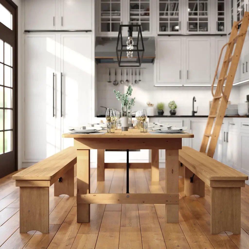 Set a stylish and rustic anchor in the heart of your home with this dining room table where family can come together for delicious food and great conversation. Accommodate visiting guests with this rustic dining table that can comfortably seat up to eight people. Pins provide extra stability while in use, pull out the pins to fold the legs for transport. With its solid construction our beautiful farm table is suitable for daily use in restaurant and hospitality industries. To keep in spotless condition, use a water based cleaner and follow-up with a dry cloth. While constructed for indoor use, our transportable dining room table can be taken outdoors for special events like family get-togethers and backyard barbecues during good weather. Achieve country-rustic appeal by leaving the table as-is, or easily dress it up with a tablecloth for elegant events.
