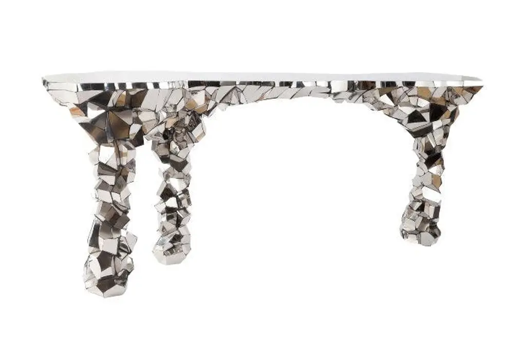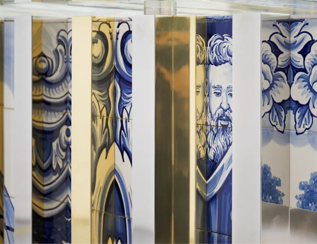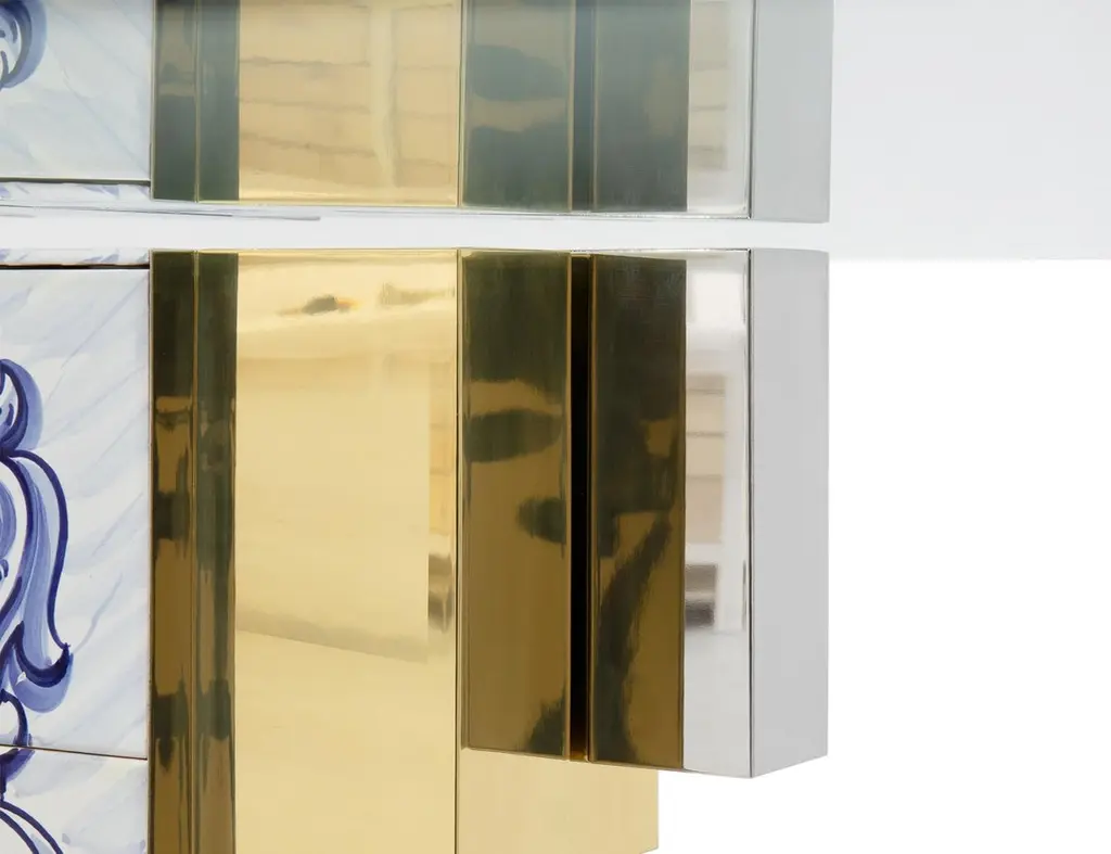The Heritage Dining Table, much like its sibling Heritage Sideboard and Cabinet, is a highly sophisticated piece inspired by Portuguese history through the use of traditional hand painted azulejo tiles. Its noble design features bold lines, with alternating polished brass, bevelled mirror and azulejo strips and a tempered glass top, which reflect your dining room’s finest elements, yet adding a touch of warmth and finesse.