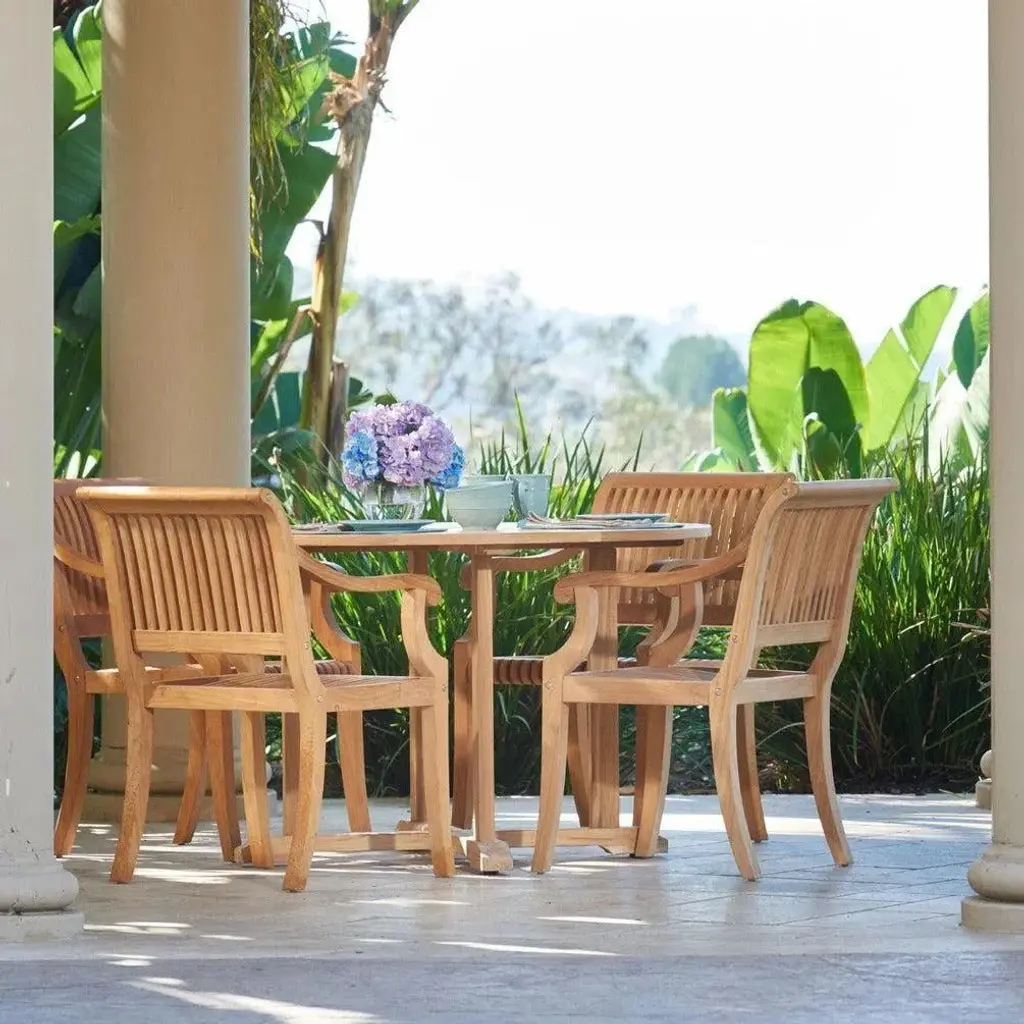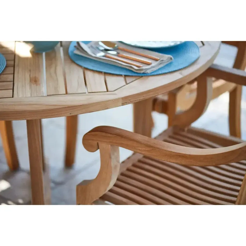 The Curtis round dining tables by Hi Teak are crafted from premium teak and come in two popular sizes. Featuring a classic pedestal base, this table complements many chairs from the HiTeak collection. The slatted tabletop promotes drainage to avoid water pooling. Made from responsibly sourced teak known for durability against rot, insects, and weather, the wood is kiln-dried to prevent cracking and features a hand-sanded finish that ages naturally. Marine-grade stainless steel hardware ensures lasting rust resistance. Curtis 47.25-inch Round Teak Outdoor Dining Table with Umbrella Hole Features: Overall dimensions: W47.25" x D47.25" x H 29.5" Seating Capacity: 6 Assembly Needed: Yes, Light Assembly Required Weather Resistant: Yes, this outdoor furniture is weather-resistant Materials: Sustainably Sourced Teak Wood Country of Origin: Vietnam Souce of Wood 1: Costa Rica Souce of Wood 2: Nicaragua Disclaimer: Surface roughness may develop especially at the end grain but over time the natural weathering process will stabilize. Small surface cracks are normal and in no way affect the structural integrity of the furniture.
