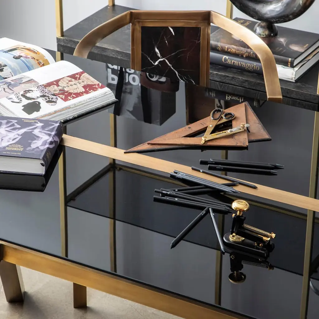 Standing out with its material diversity and geometric forms, the HIDDEN series takes its place in the upper segment design world with its nostalgic design approach and fine craftsmanship. Standing out with its dark tones, the collection manages to fascinate with its elegance regardless of product size. Offering a combination of black and brass lines, the HIDDEN table offers a symmetrical elegance to your common area.Colors may appear different on your screen depending on display settings, resolution, device type, and device age. Please contact if you have questions about color .Dimensions:Width: 180cmDepth: 90cmHeight: 78cmMaterial information:- Black Glass - Brass - Proprietary Design