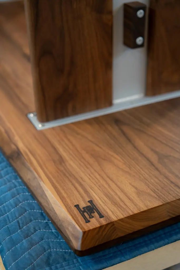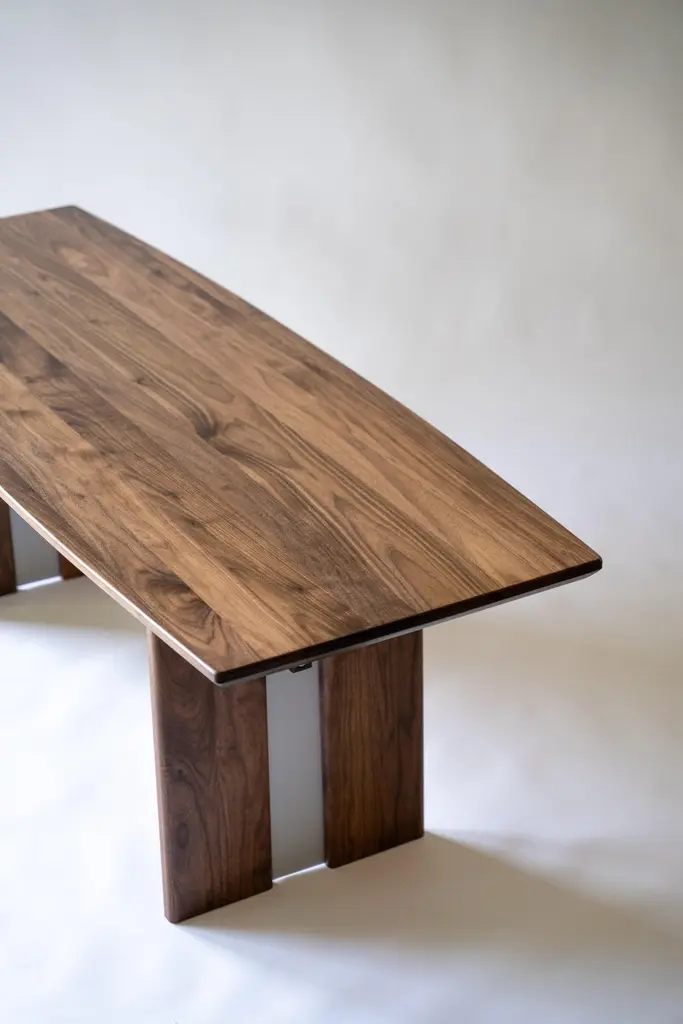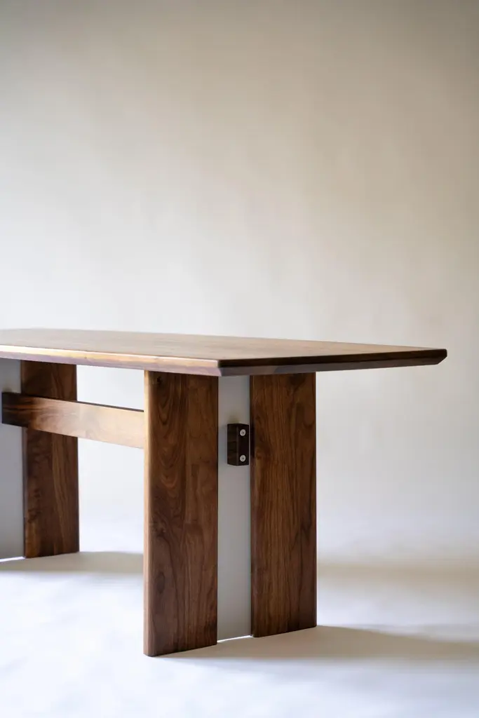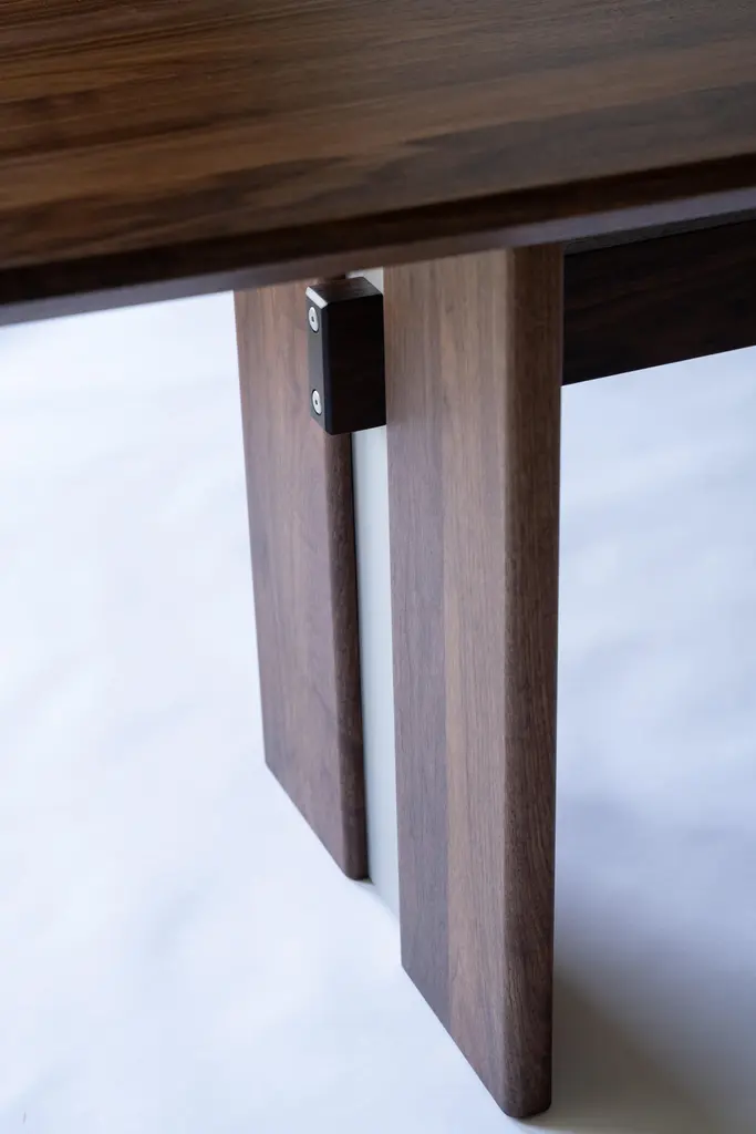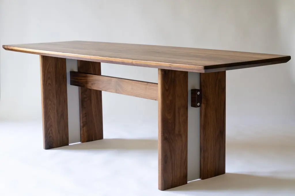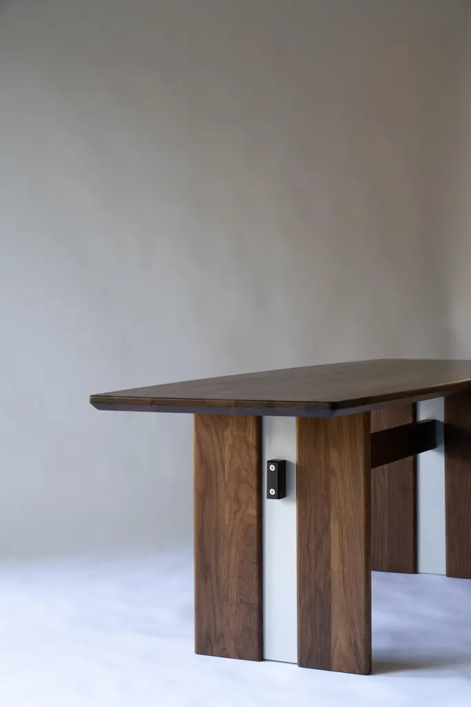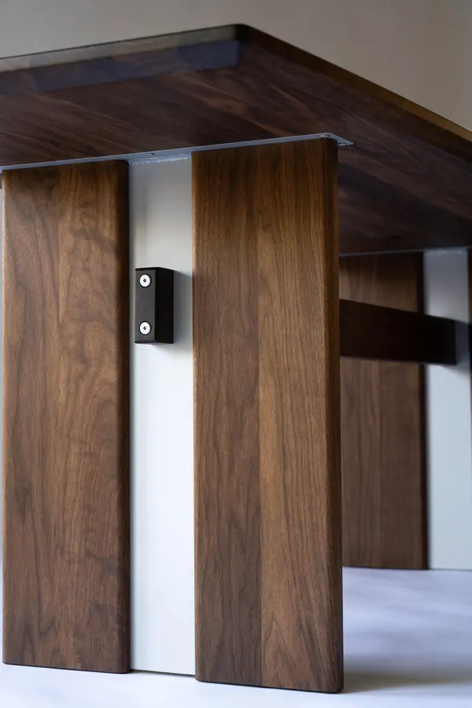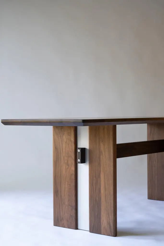 Hillside Dining Table – Black Walnut and Powder-Coated SteelThe Hillside Dining Table is a timeless blend of natural craftsmanship and refined design. Built from solid black walnut and welded, powder-coated steel, it gives a nod to classic mid-century style with its sweeping edge profile, sculpted walnut legs, and floating crossbar detail. Each leg is carefully hand-shaped and precisely fitted to meet its steel accent seamlessly, showcasing thoughtful joinery and attention to detail. Handcrafted in Portland, Oregon by the Harkavy brothers in their Willamette Valley workshop, this table balances strength and elegance, making it a striking centerpiece for dining spaces. Its generous proportions comfortably seat six to eight, perfect for everyday meals or gathering around with friends.Dimensions: H 30 in. x W 30 in. (taper to 26 in.) x L 84 in.
