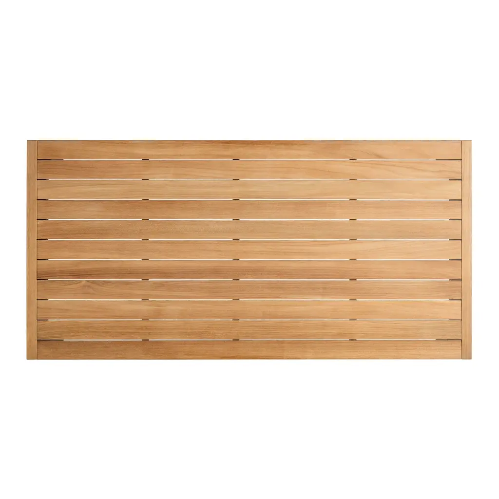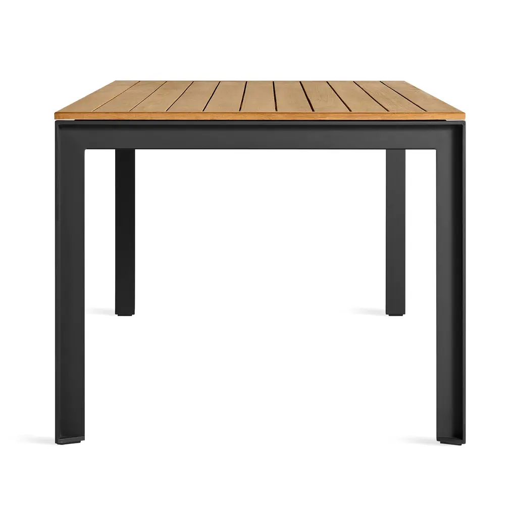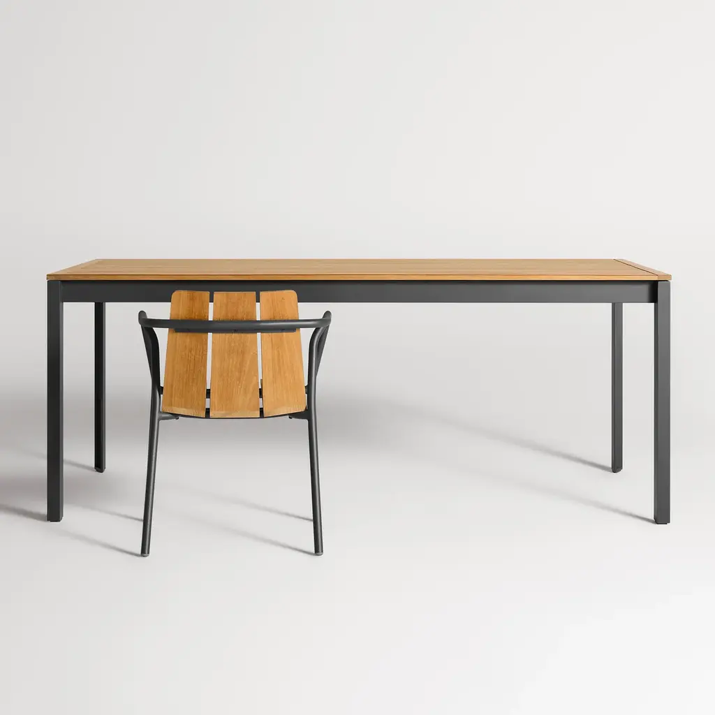 FSC-certified teak teams up with powder-coated aluminum to bolster your backyard activities. With smartly spaced teak slats that allow water to drain and wood to expand or contract, Hold Tight was designed for hot days and rainy nights. Sculptural, industrial-inspired details elevate the rugged base. Proportioned to party.