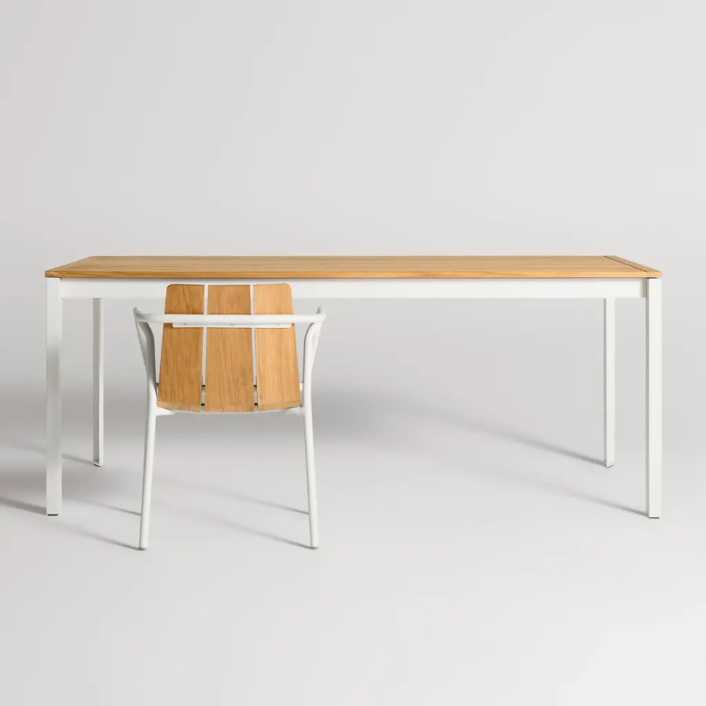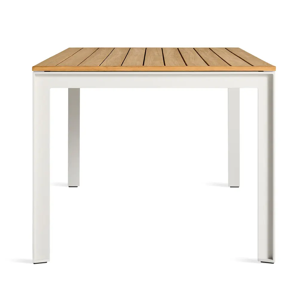 FSC-certified teak teams up with powder-coated aluminum to bolster your backyard activities. With smartly spaced teak slats that allow water to drain and wood to expand or contract, Hold Tight was designed for hot days and rainy nights. Sculptural, industrial-inspired details elevate the rugged base. Proportioned to party.