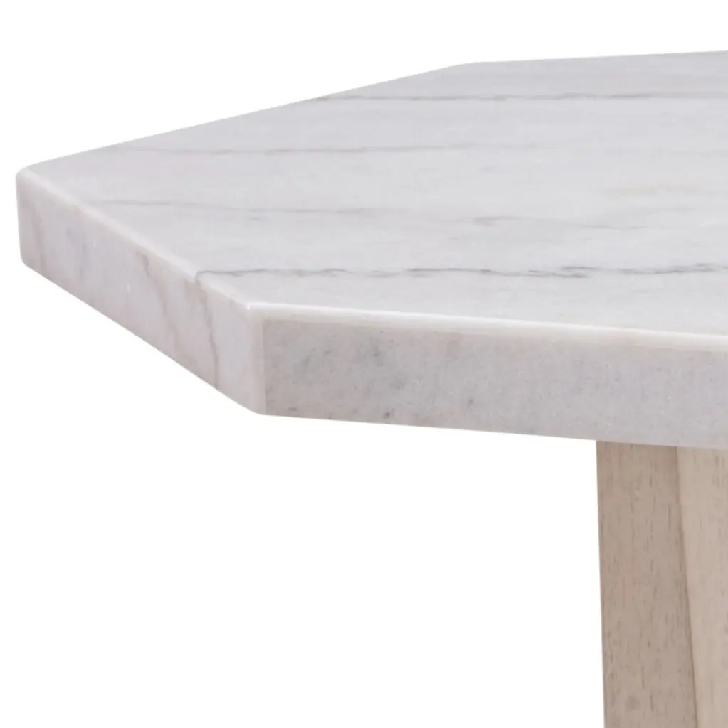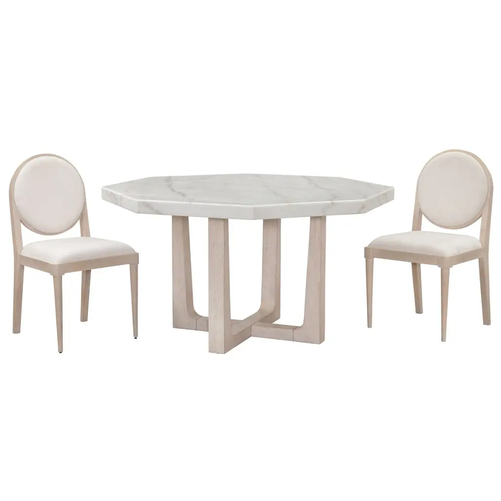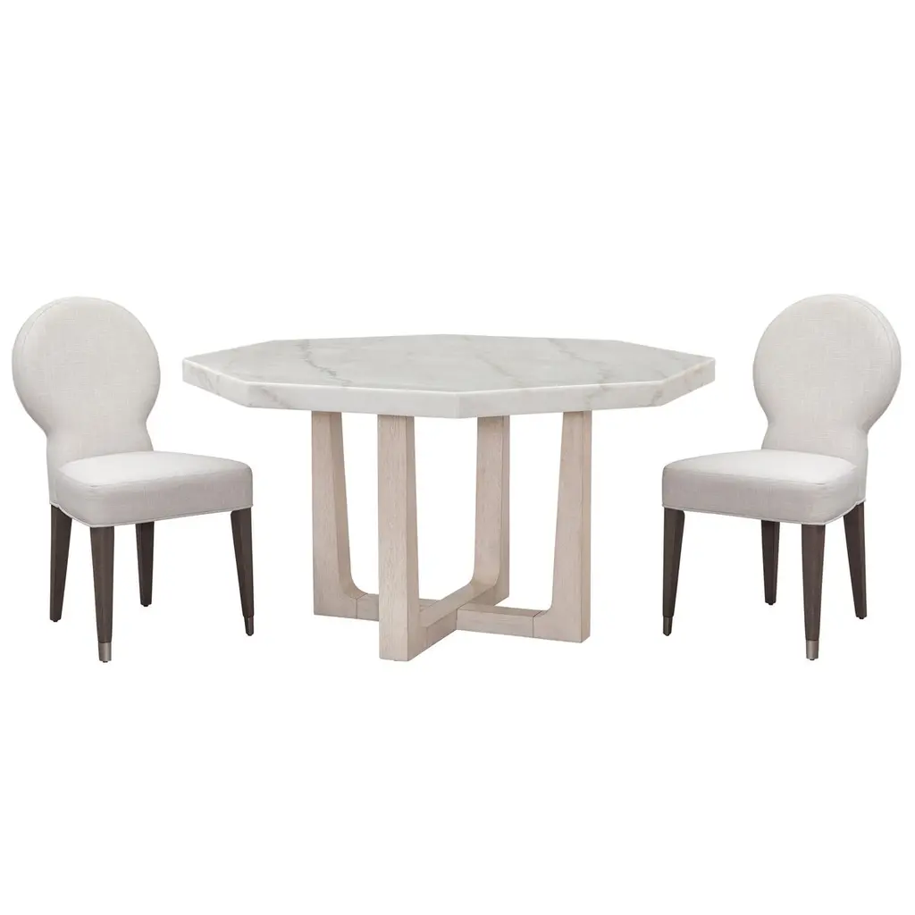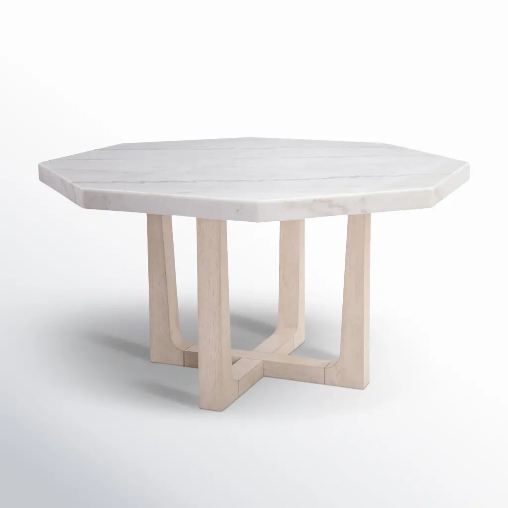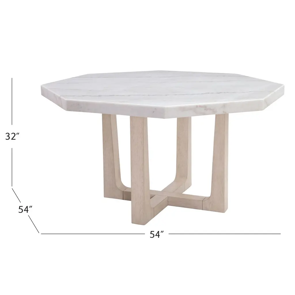 The Holden Dining Table embodies a coastal modern style, characterized by its fresh and airy finish, paired with the elegance of white marble. Its base is crafted from ash veneer with a sun-bleached finish, complementing the thick, tapered legs. At the heart of this table, you'll find a striking 54" hexagonal white marble top that adds a touch of sophistication. Comfortably seats 4-6 people, making it the perfect gathering place for family and friends. With a blend of sun-bleached ash and light marble finishes, the Camden Dining Table seamlessly combines style and substance.