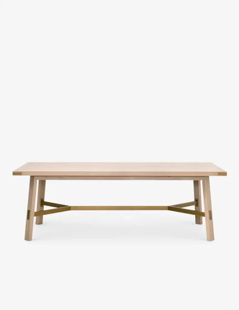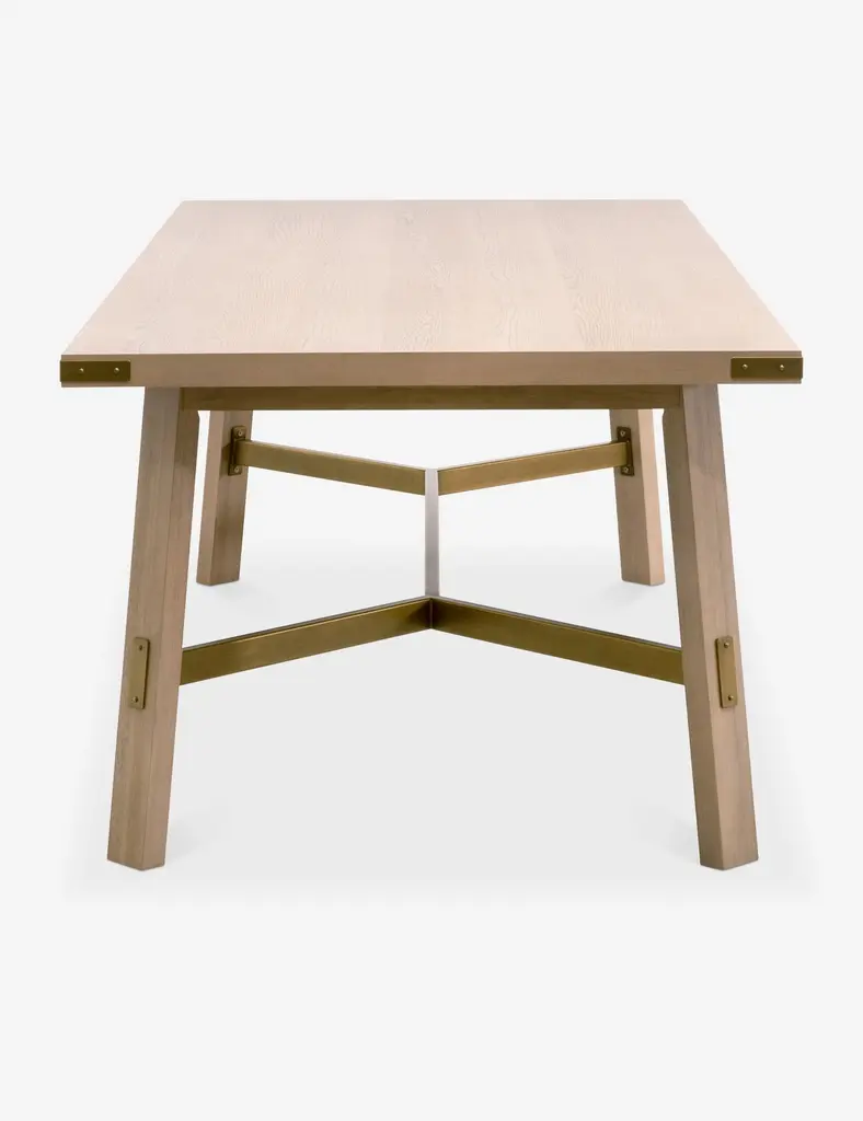 The Hollier dining table brings a modern touch to rustic warmth. Its clean-lined design is elevated with angular legs and a metal stretcher with matching accents. The warmth of the oak veneers against the brushed gold finish styles a timeless table for years to come.