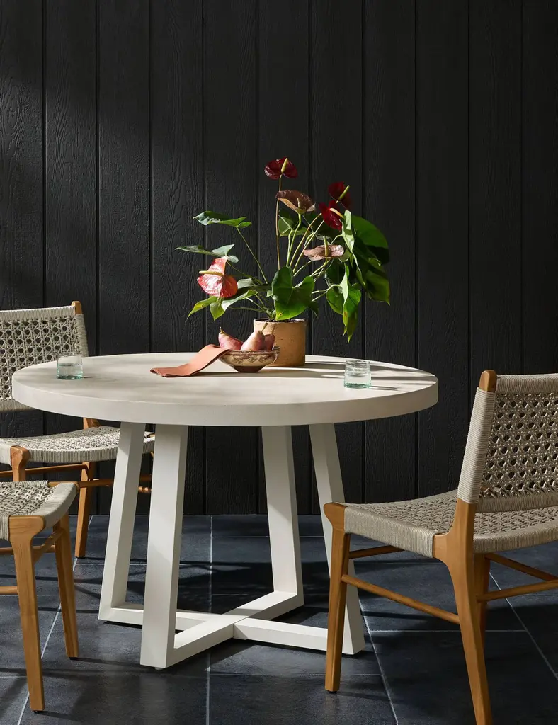 For modern style indoors or out, add this round dining table to the mix. Featuring a lava stone top and angular iron base, this table offers a minimalistic look with an industrial edge.