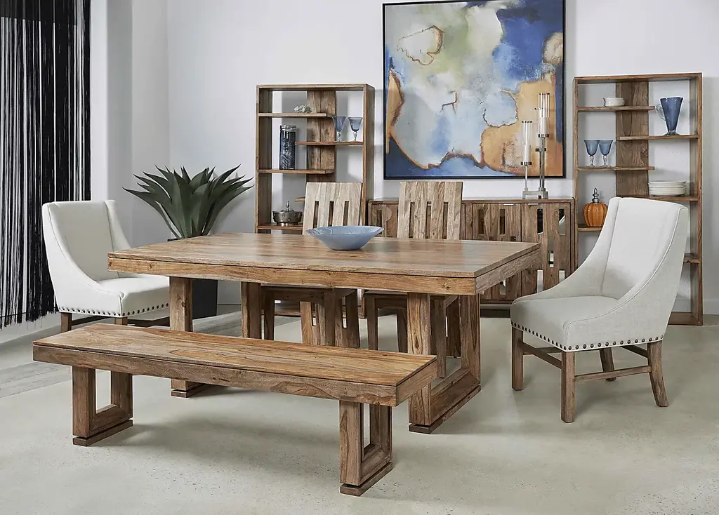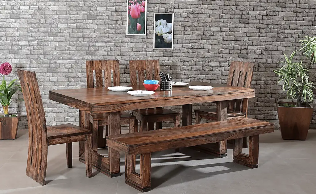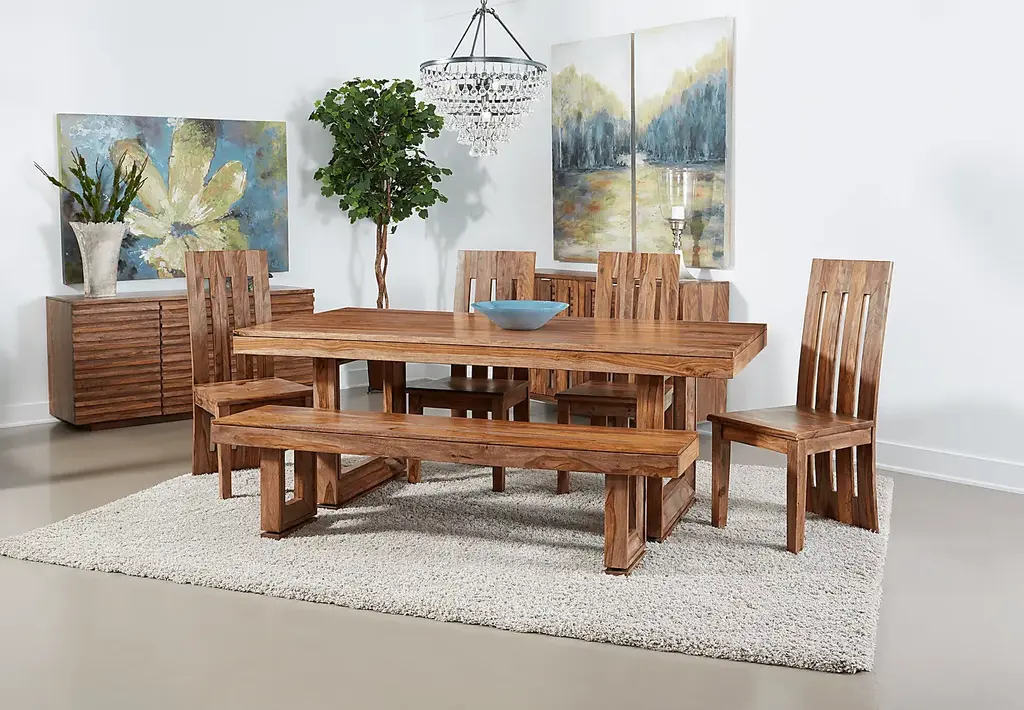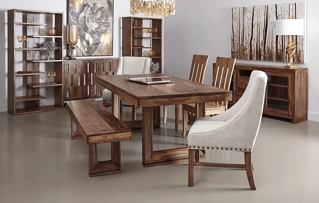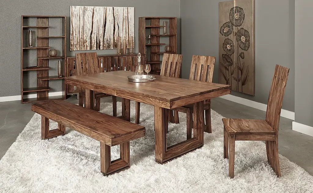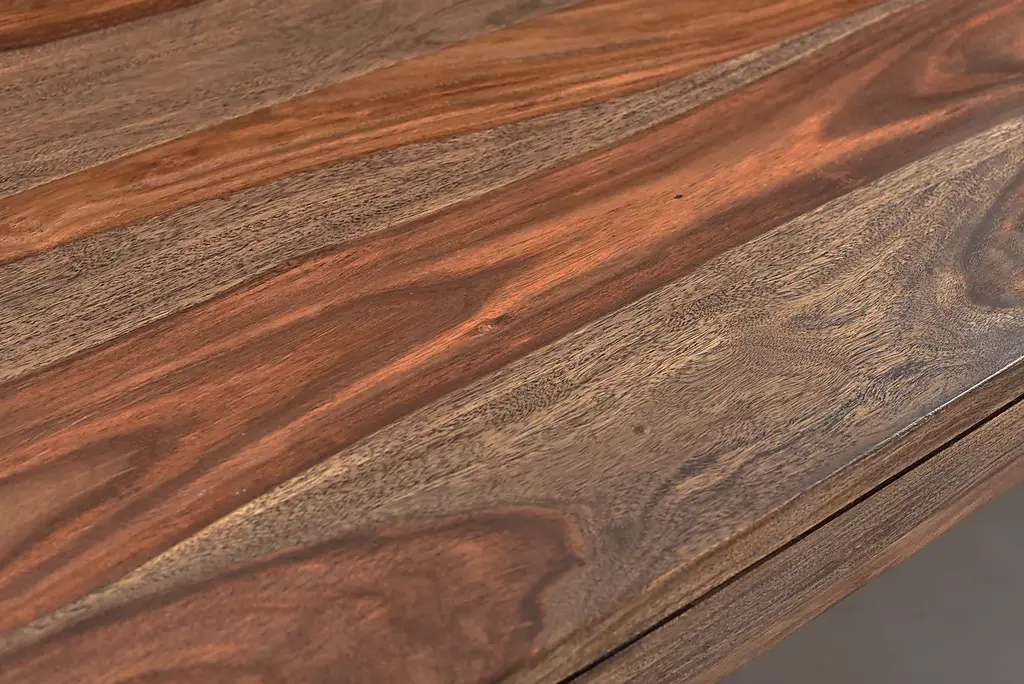 Your family and friends are sure to be wowed when they walk into your home and see this stunning Holwyn dining table. Constructed of solid sheesham and finished in a nut brown the Holwyn is destined to produce an audible gasp from all. The rich brown finish highlights the richness and beauty of the wood grain. With the small route line running along the apron, the top seemingly floats. The picture frame detailing of the legs add another dimension to the simple design. The table floats effortlessly above the floor with the addition of the routing along the leg base. With proper care and use this table will provide pleasure for generations to come. Table comfortably accommodates six. Customer assembly is required.