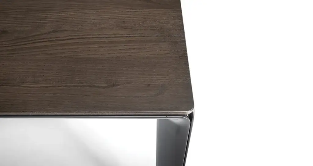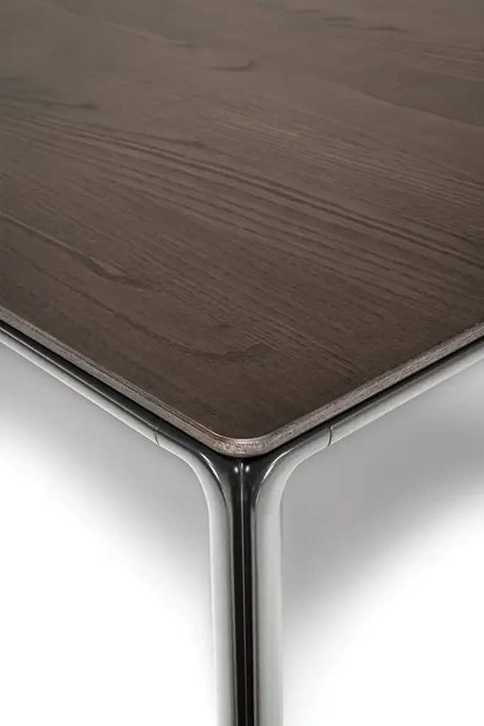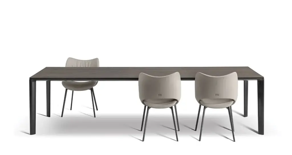 The Homey dining table designed by GamFratesi aims to shine a renewed light on the value of the home and emphasize the centrality of its role in domestic settings that are increasingly attentive to sharing. This designer table is compact and graphic, characterised by light but volumetric lines, enriched by fine and expertly worked materials.The quintessence of Homey is expressed in its die-cast aluminium legs. In a sculptural play reminiscent of haute couture, the two leg flaps fold and join together without touching, creating a chiaroscuro effect in the centre. A refined stylistic exercise that recalls the workmanship of leather, Poltrona Frau's material of choice. The lines of the two flaps open slightly at the top to transform into the shelf that supports it. The dining table is produced in four sizes in a rectangular and a square version, and supports wooden or marble tops. Homey introduces a more contemporary language of design for a warm and welcoming home, full of elegant and distinctive products.