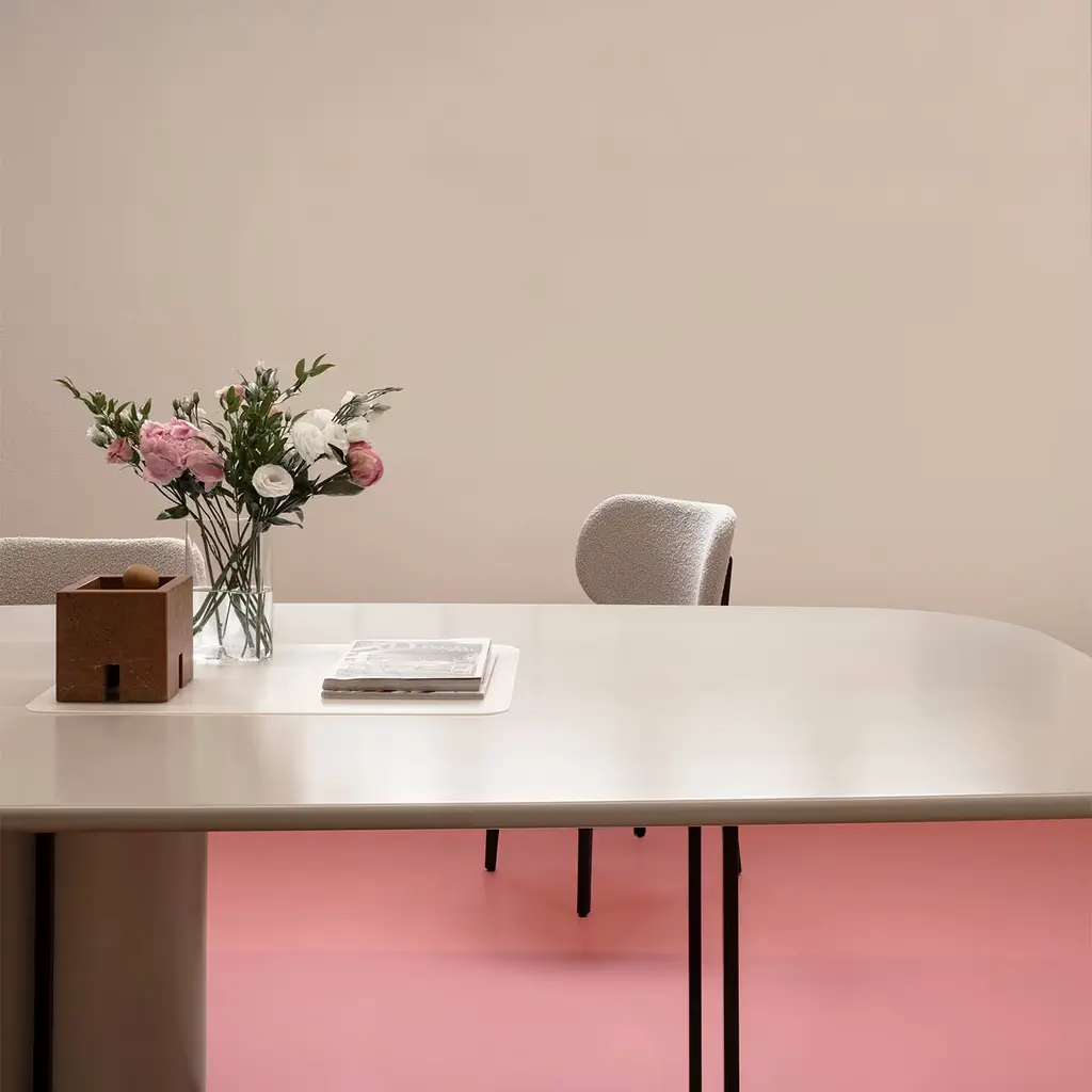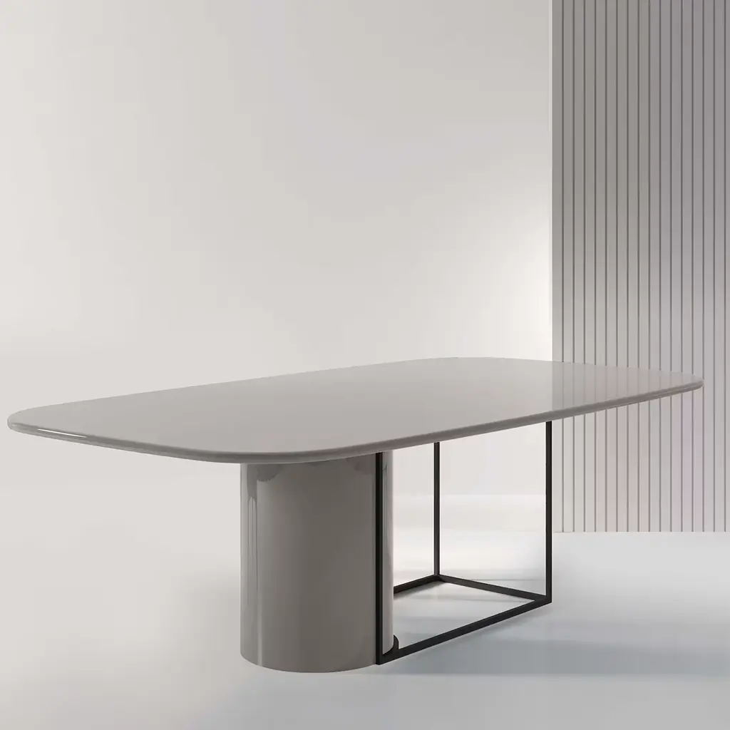 The Horus Dining Table by Artefatto Design Studio artfully balances solid and empty spaces. The cylindrical base can be positioned within or slightly away from the sleek metal frame, highlighting the contrast between these elements. The tabletop is finished in Wood Lacquered Glossy Window Grey, while the Jet Black metal lacquered structure adds a modern touch. Available in different finishes and colours.