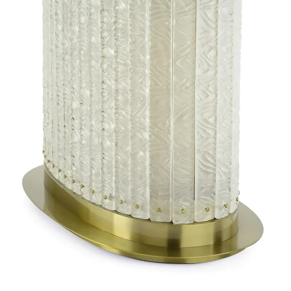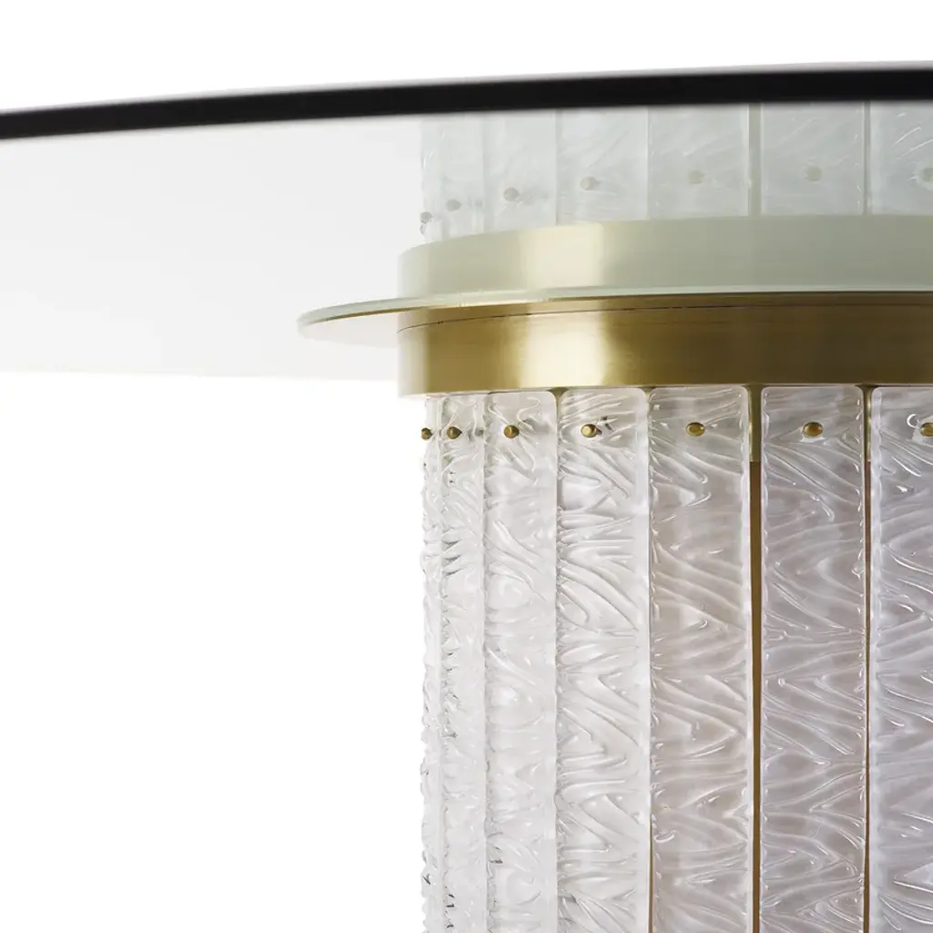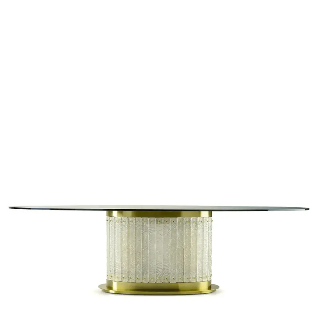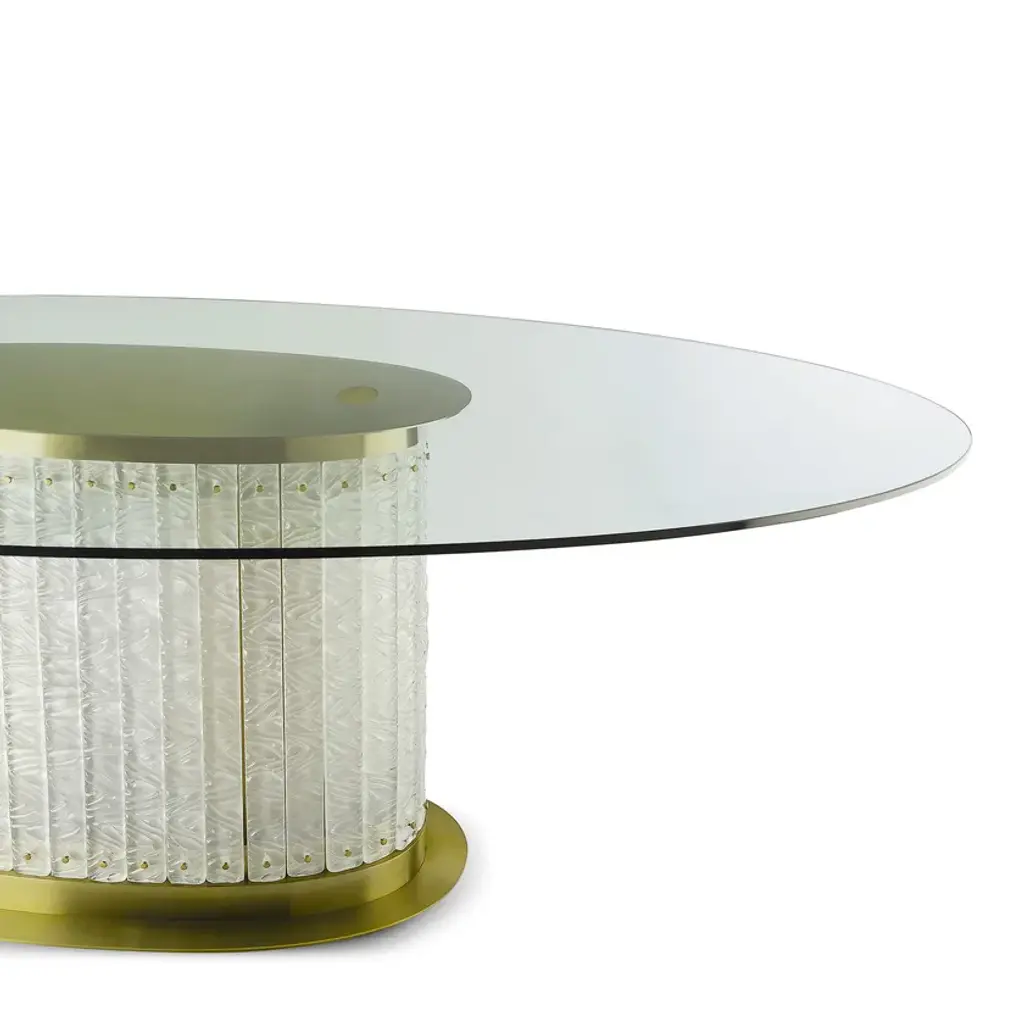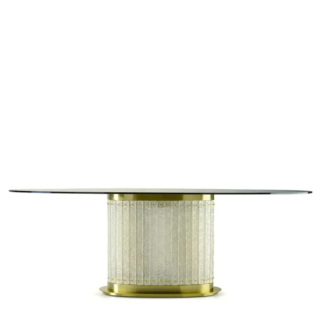 Elegant and refined Howard oval dining table with metal structure and decorative glass elements. The top is fixed with a plate bonded with UV system.Howard - Tables with structure made in thick metal flat bar, with brushed brass finishing. Tops available in many different combination like veneers, marbles and parchment. The curved junctions and the functional details add elegance to these magnificent pieces of furniture.