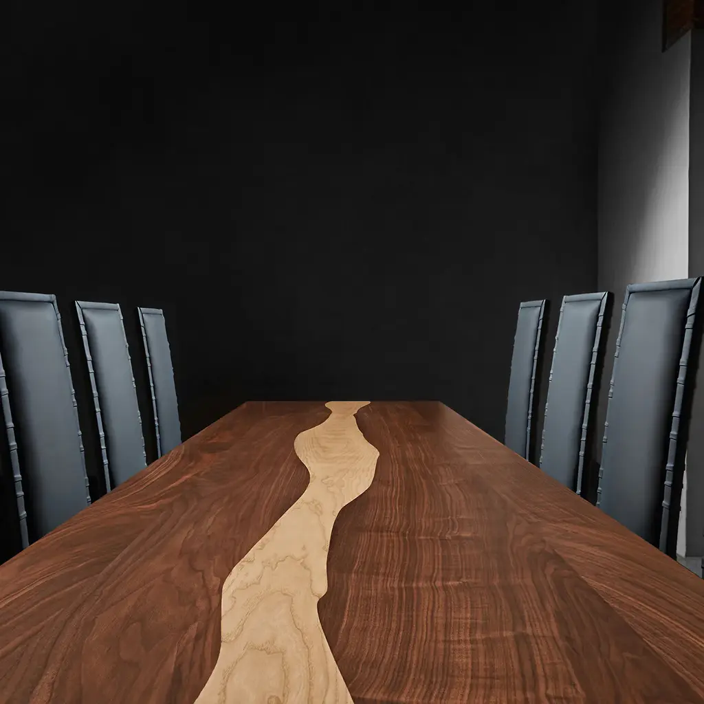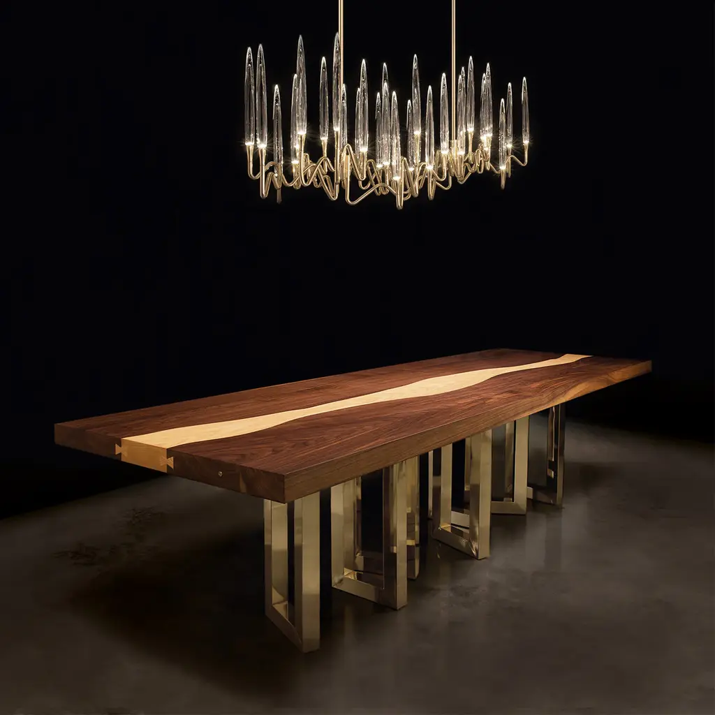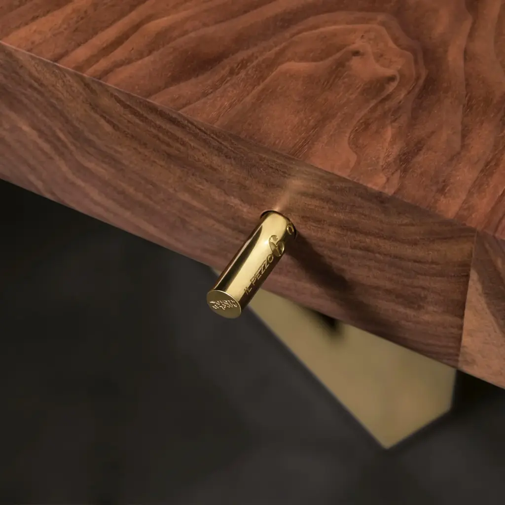 Il Pezzo 6 Table in fine walnut rests harmoniously on a series of hand-crafted brass legs, while a wood streak in a contrasting color runs across its surface. This sophisticated piece is finished with natural oil that protects the wood while letting it breathe.In each piece, a small brass cylinder with a personalized number attests to its uniqueness and authenticity.This piece can be custom made to your desired size and finish.